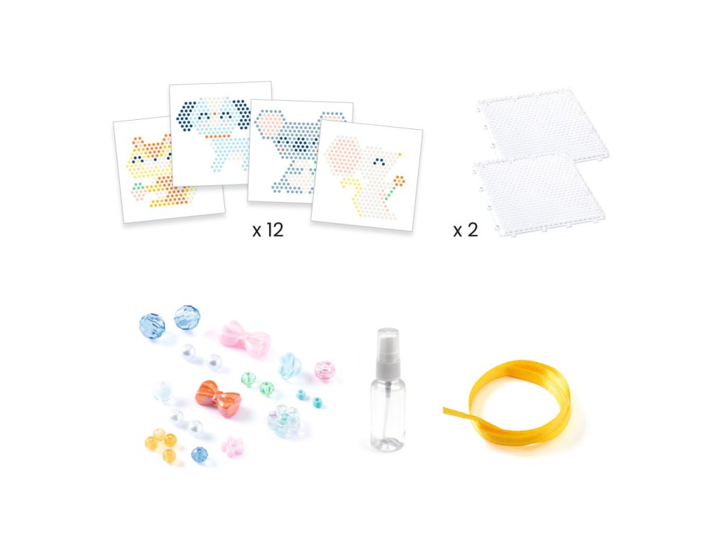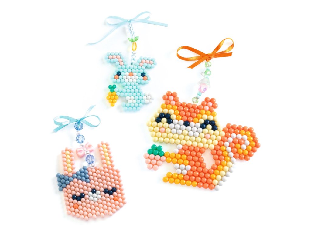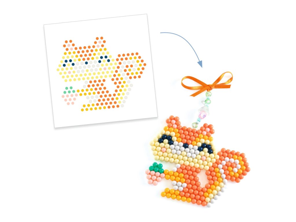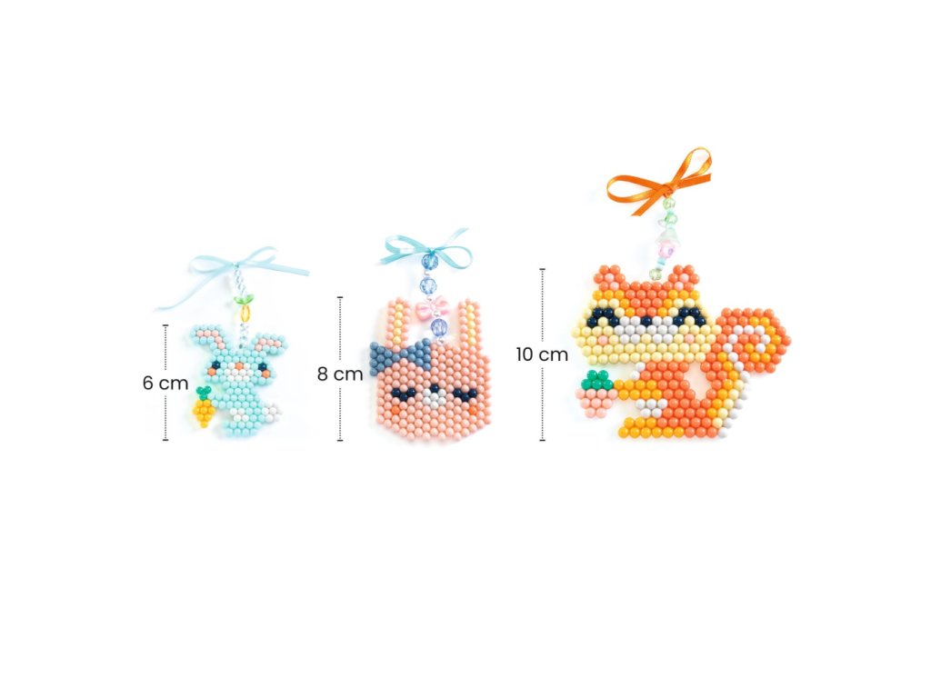 Zvieratká z guľôčkových korálok si dieťa vyrobí ukladaním korálok/guličiek na priehľadnú podložku. Najskôr si však pod podložku uloží predlohovú kartičku so vzorom. Korálky popráši pomocou rozprašovača vodou, aby sa zlepili a potom môže hotovú ozdôbku vybrať z podložky. Na ozdôbku ešte pripevní niť a pridá bižutérne doplnky. Tvorbou prevedie obrázkový návod.
