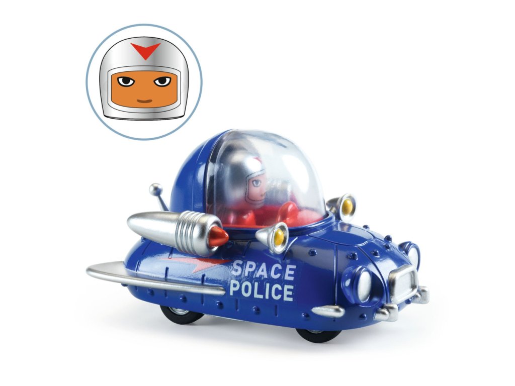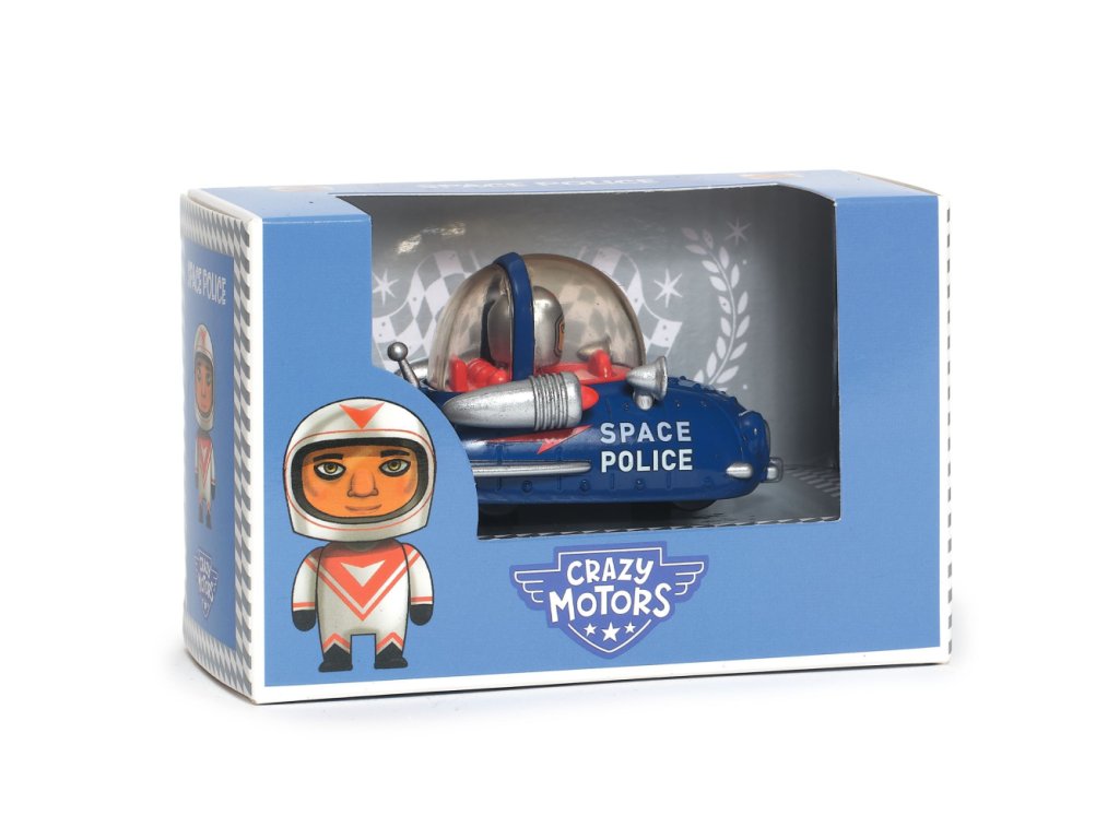 V úžasnom svete Crazy Motors hliadkuje náš nebojácny policajt vo vesmíre, aby udržiaval mier a poriadok! Kolekcia Crazy Motors vznikla z myšlienky vytvoriť pretekárov a vodičov a následne jedinečné autá, ktoré sú výrazom ich výstrednej osobnosti. Žiadna figúrka sa nedá vybrať z auta, ale dá sa jej otáčať hlavou. Konštrukcia auta je kovová, odolná proti nárazom. S pôsobivými aj bláznivými líniami karosérie sa prelínajú nápadné detaily z plastu. Šialený dizajn dotvára metalíza. Podvozok má mäkké perovanie na hladkú jazdu a hojdavý efekt a gumené pneumatiky na úžasné manévre. Tieto zberateľské kúsky zaručene potešia!