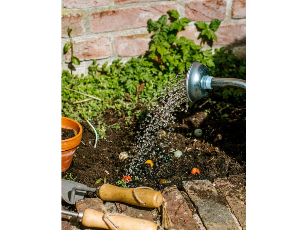 - Bombu zľahka vtlačte do mäkkej hliny, nie veľmi – len tak, aby zostala trčať na povrchu, a zalejte ju alebo počkajte na dážď.
