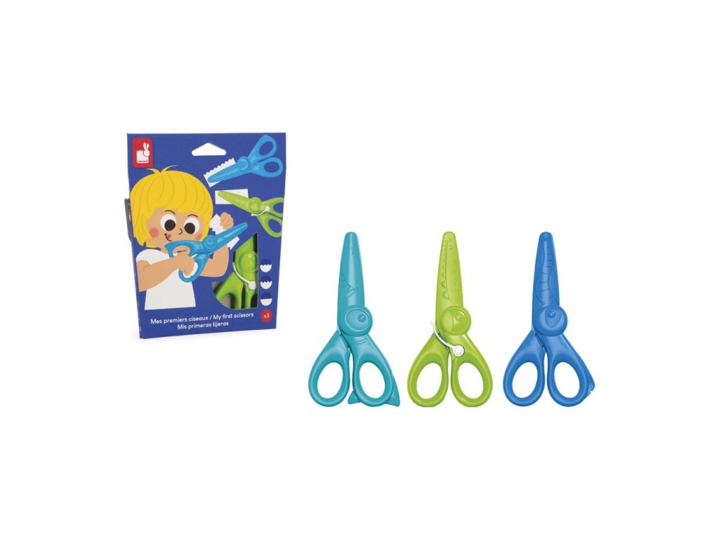 S touto sadou 3 párov nožníc môžu deti od 3 rokov bezpečne objavovať radosti decoupage. Každý pár má iné zvieratko na sebe zobrazené a iný strih pre rôzne výtvory: zaoblený strih so slonom, cik-cak strih so žralokom, rovný strih s krokodílom.