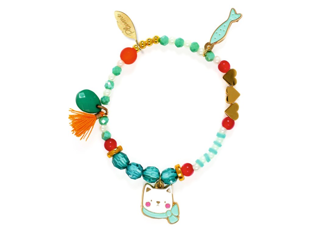 Náramok Hanaé s motívom mačičky dodá každému detskému outfitu roztomilý a hravý nádych. Zdobia ho dva smaltované kovové prívesky mačka a rybka a strapec. Akrylové koráliky sú navlečené na dvojitej elastickej niti, ktorá zaisťuje ľahké nasadenie a pohodlné nosenie.