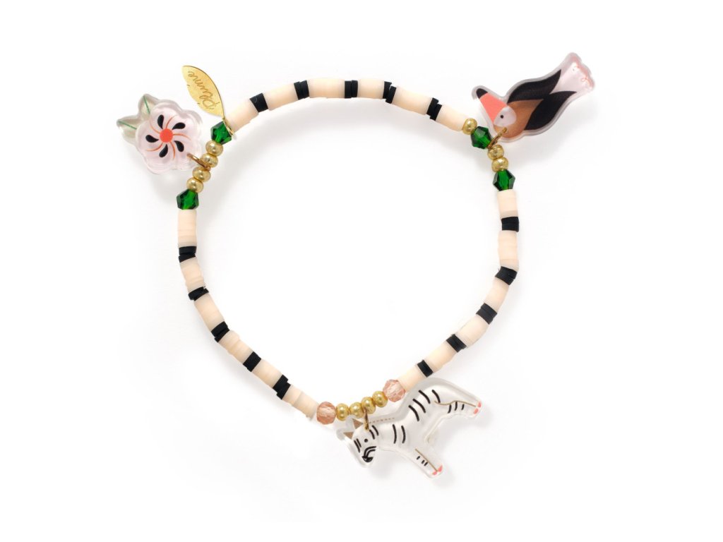 Náramok Jemma je inšpirovaný džungľou a jej farbami. Zdobia ho akrylové koráliky a tri prívesky, zebra, kvetina a tukan. Vďaka dvojitej elastickej niti sa ľahko nasadzuje a pohodlne nosí.