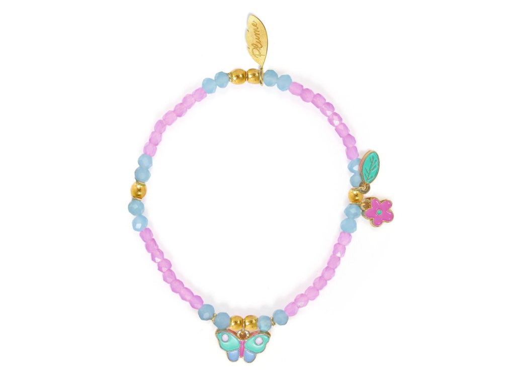 Náramok Lila je inšpirovaný pokojom a krásou záhrady. Zdobia ho tri smaltované kovové prívesky, motýľ, kvetina a list a jemné akrylové koráliky. Vďaka dvojitej elastickej niti sa ľahko nasadzuje a je pohodlný na nosenie.