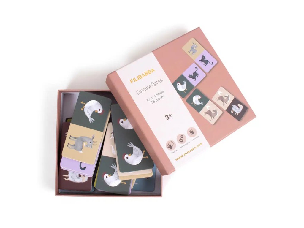 Vaša nová domino hra obsahuje 28 veľkých dielikov s farebnými ručne kreslenými ilustráciami, ktoré zobrazujú roztomilé zvieratká.