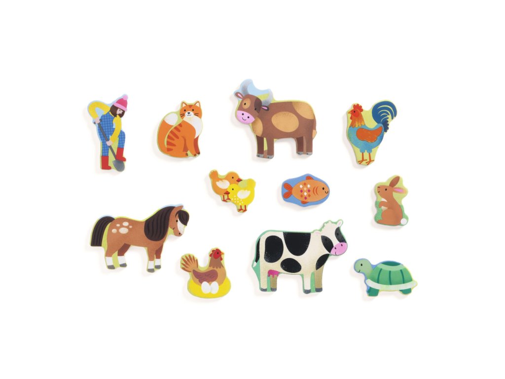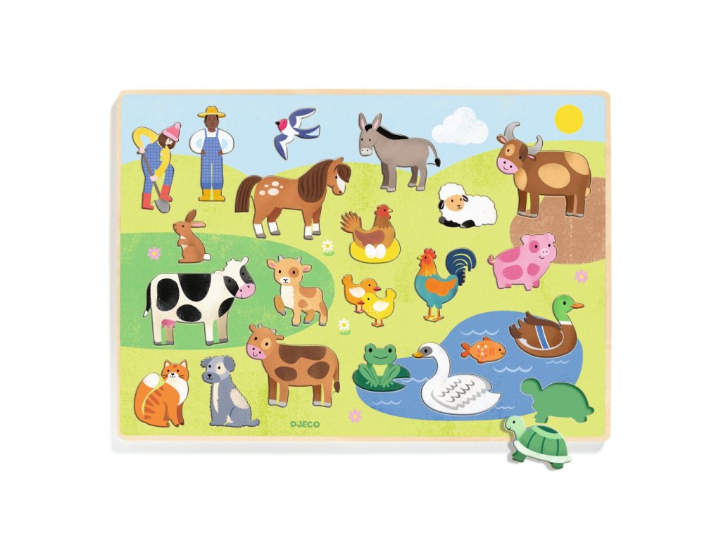 Puzzle z DJECO kolekcie Puzzlo. Dieťa vkladá 22 dielikov tak, že ich priradí k siluetám známych farmárskych zvieratiek na drevenej podložke.