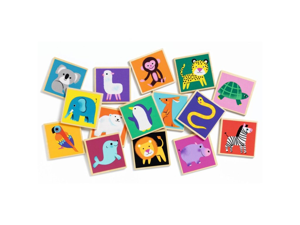 Pexeso obsahuje drevené štvorcové diely s ilustráciami zvieratiek. Diely otočte lícom nadol a postupne ich otáčajte. Kto nájde zhodný pár, nechá si ho a môže otočiť ďalšiu dvojicu. Kto získa najviac zhodných párov, je víťaz.