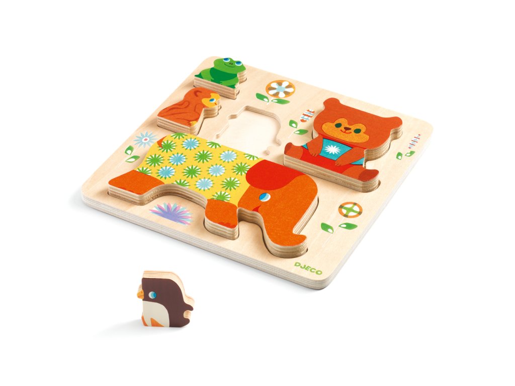 - 1. Reliéfne puzzle: dieťa vloží 5 drevených ilustrovaných dielov do výrezov na drevenej ilustrovanej podložke. Každé zvieratko (slon, medveď, tučniak, opica, žabka) má svoje miesto.
