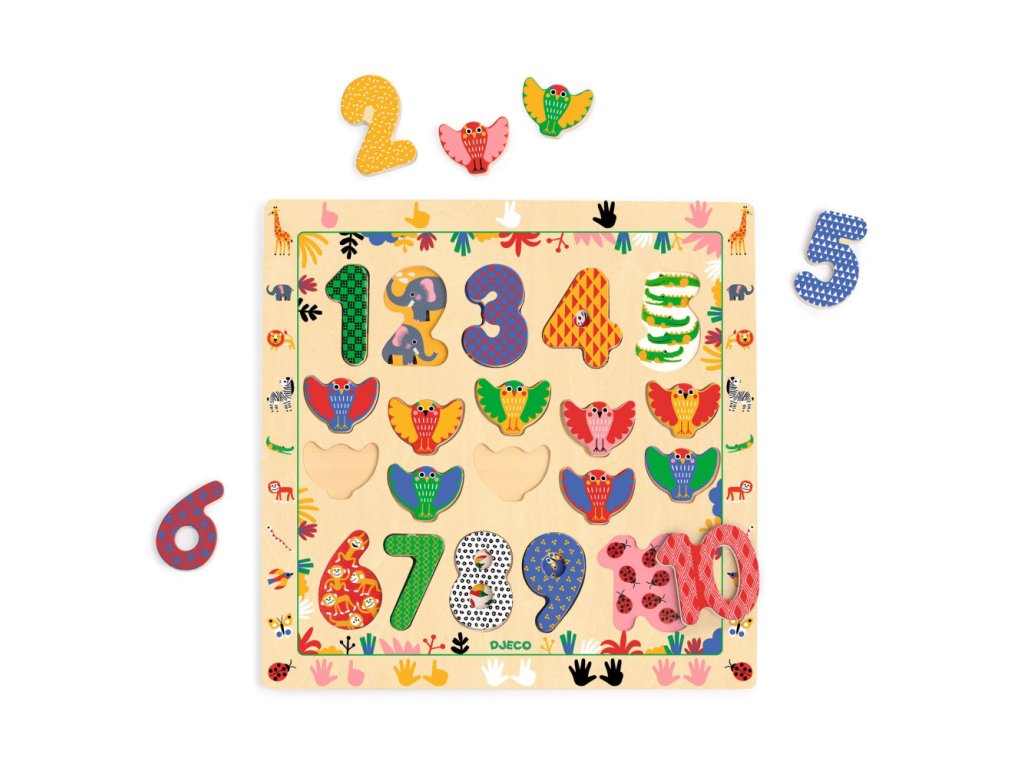 Puzzle, ktoré je ideálne na zoznámenie najmenších s číslami od 1 do 10. Deti priraďujú každé číslo k správnemu políčku počítaním počtu zvierat pod ním: 1 žirafa pod číslom 1, 2 slony pod číslom 2, 3 levy pod číslom 3 atď.! Do vzdelávacieho procesu je možné pridať zábavné hry: deti môžu počítať poradie zvierat na okraji alebo si pozrieť, ako sú čísla znázornené prstami pomocou kresieb rúk.