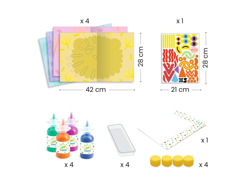Obsahuje 24 predlohových obrázkov (12 obojstanných kariet), ktoré sa dieťa naučí kresliť krok za krokom. Dieťa dokreslí do mriežky na doske z pevnej lepenky pravú polovicu obrázka podľa osovej súmernosti. Aby vznikli čo najsymetrickejšie obrázky, sú na ľavej strane dosky praktické kolíčky na uchytenie predlohového obrázka. Sada obsahuje aj handričku na zotretie kresby z dosky.