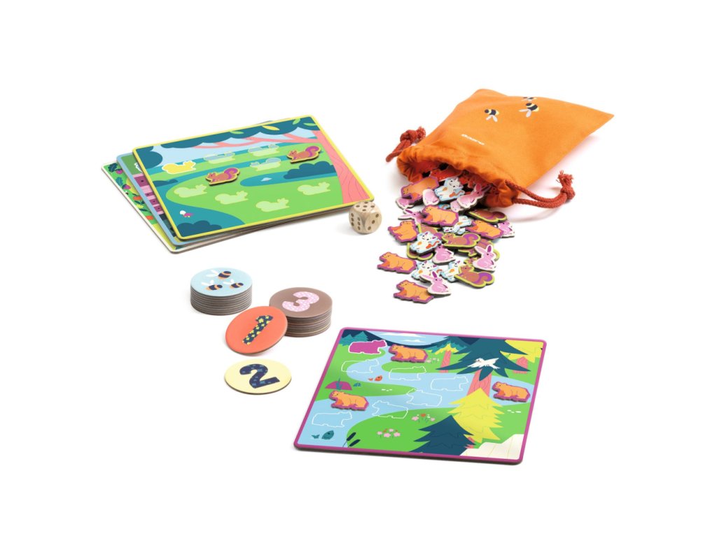 Obsah: 1 kocka, 4 dosky, 60 kariet zvieratiek, 20 kariet s číslami/súhvezdiami a 1 látková taška.