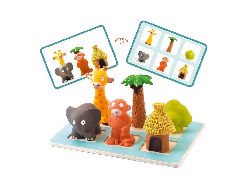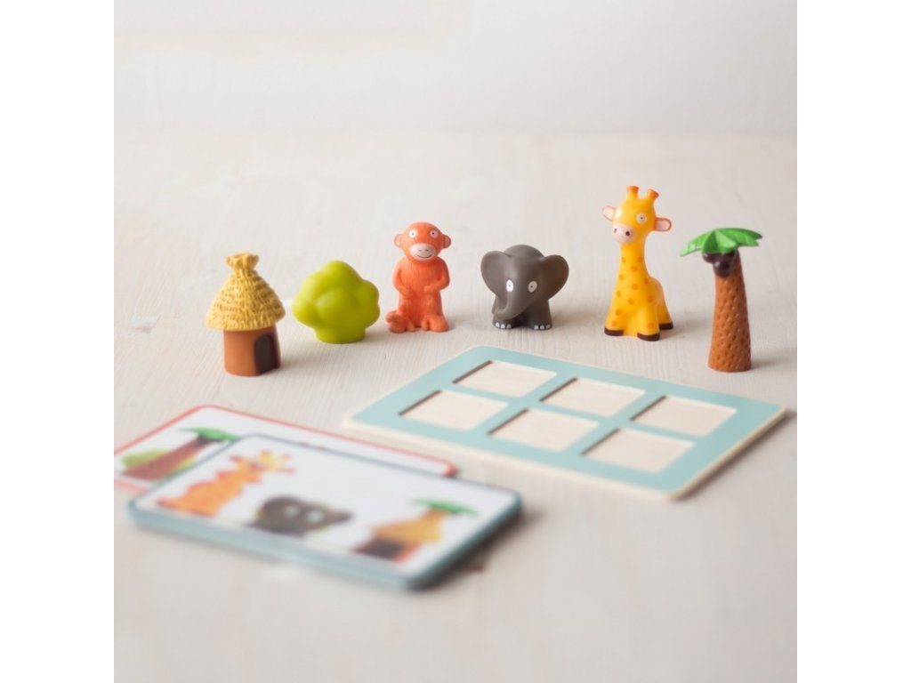 Hra obsahuje drevenú hraciu dosku, rozčlenenú na 6 políčok. Tvojou úlohou je umiestniť na každé políčko 1 figúrku tak, aby to nakoniec vyzeralo ako na obrázku predlohovej karty. Dvojdimenzionalitu obrázka musíš preniesť do trojdimenzionality priestoru na hracej doske. Tým, že figúrkami skutočne manipuluješ, je tvoje učenie efektívnejšie.