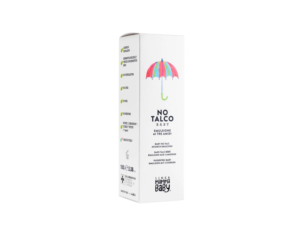 Dermatologicky testované na citlivej pokožke, emulzia z 3 škrobov s extraktmi z organického poľnohospodárstva, vitamín E, bez mastenca, bez vazelíny, bez farbív, bez vône. Každá výrobná šarža je testovaná na nikel*, chróm*, kobalt* (* <1 ppm). Vyrobené v Taliansku