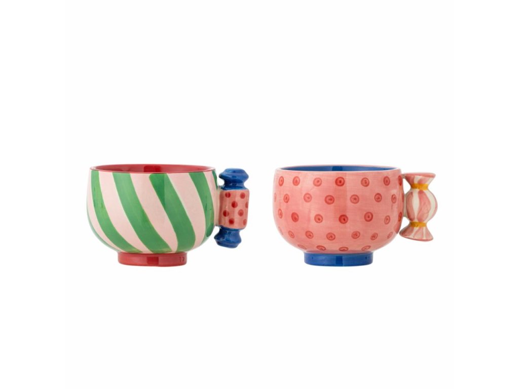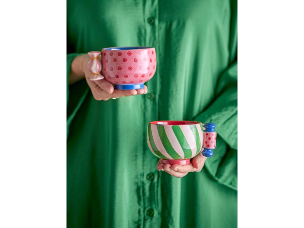 Pohárik Caramella od Bloomingville je vyrobený z kameniny a má pôvabnú rúčku v tvare zabaleného cukríka. Ideálna šálka na príjemné chvíle s horúcim kakaom, marshmallow a teplými objatiami alebo poslúži aj ako šálka na kávu pre dospelých. Vďaka ručne maľovanej technike sa každý hrnček mierne líši vzorom a rozložením farieb, čo zaručuje, že každý hrnček bude jedinečný.