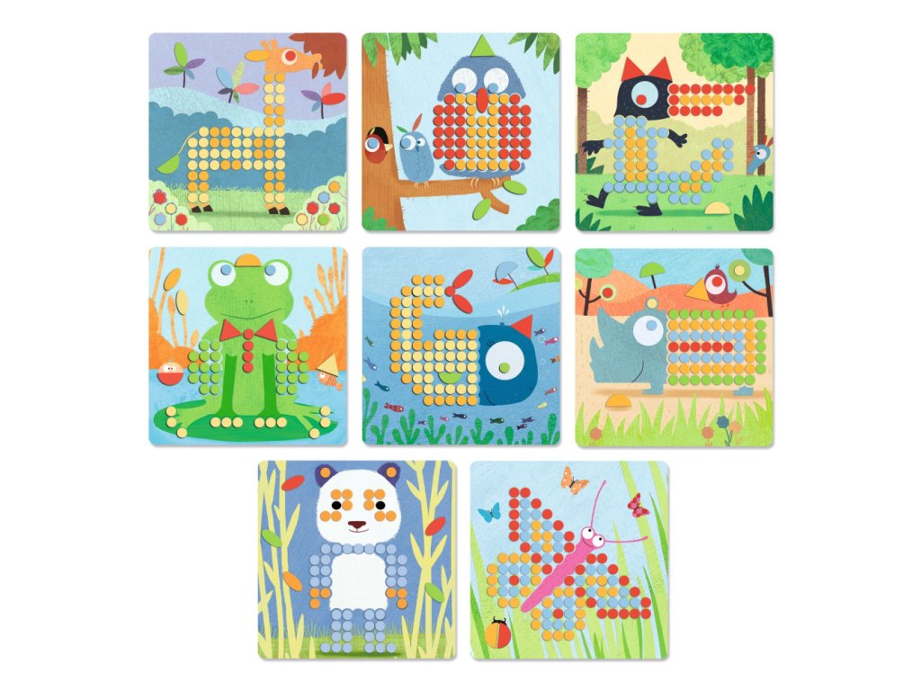 Zábavná mozaika pre mladšie detičky. Pomocou farebných kolíčkov môžu vytvoriť 8 krásnych obrázkov.
