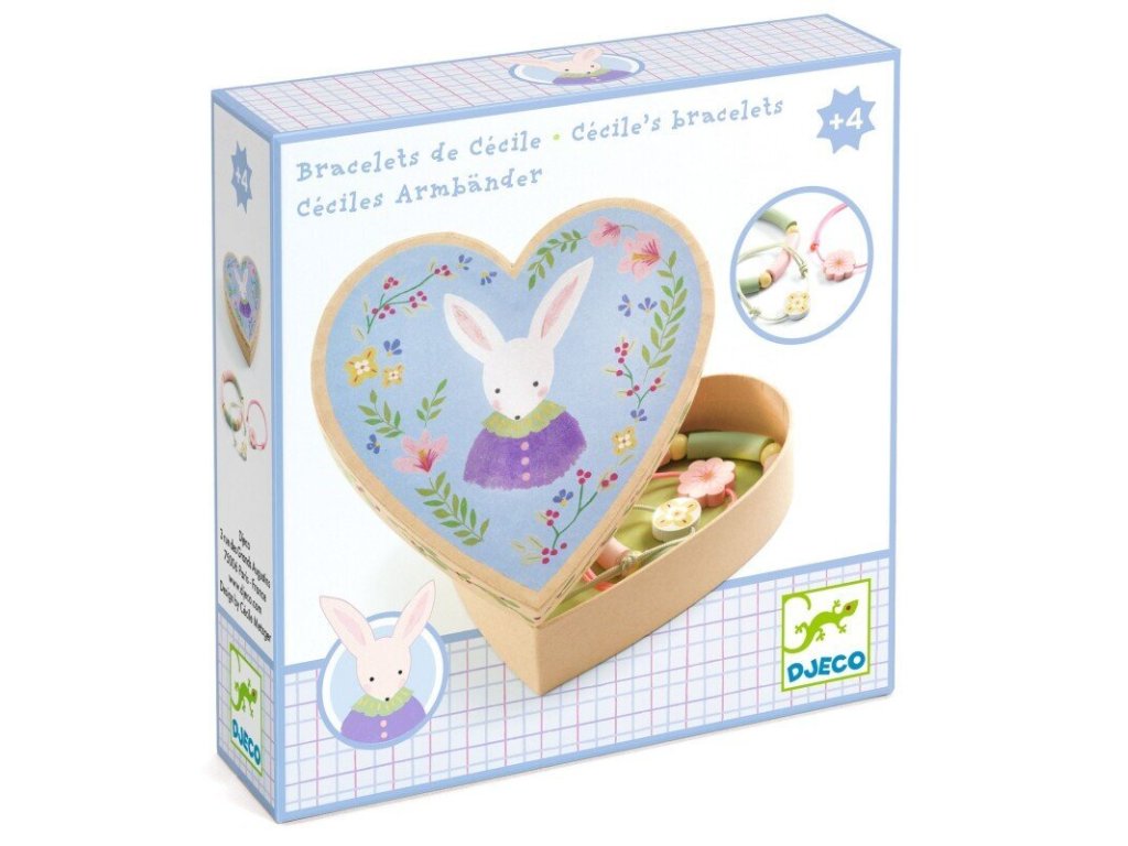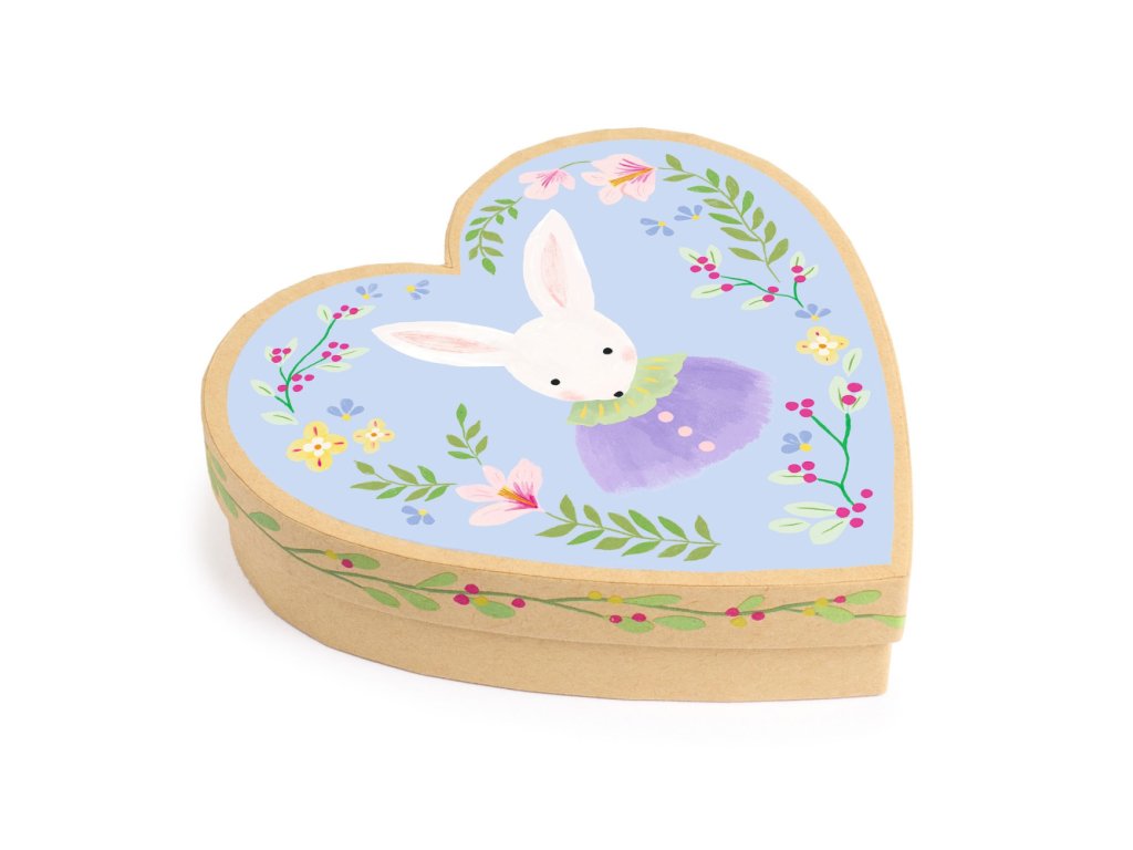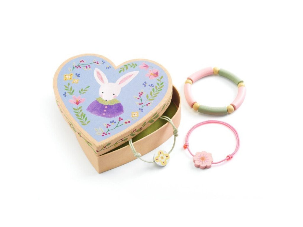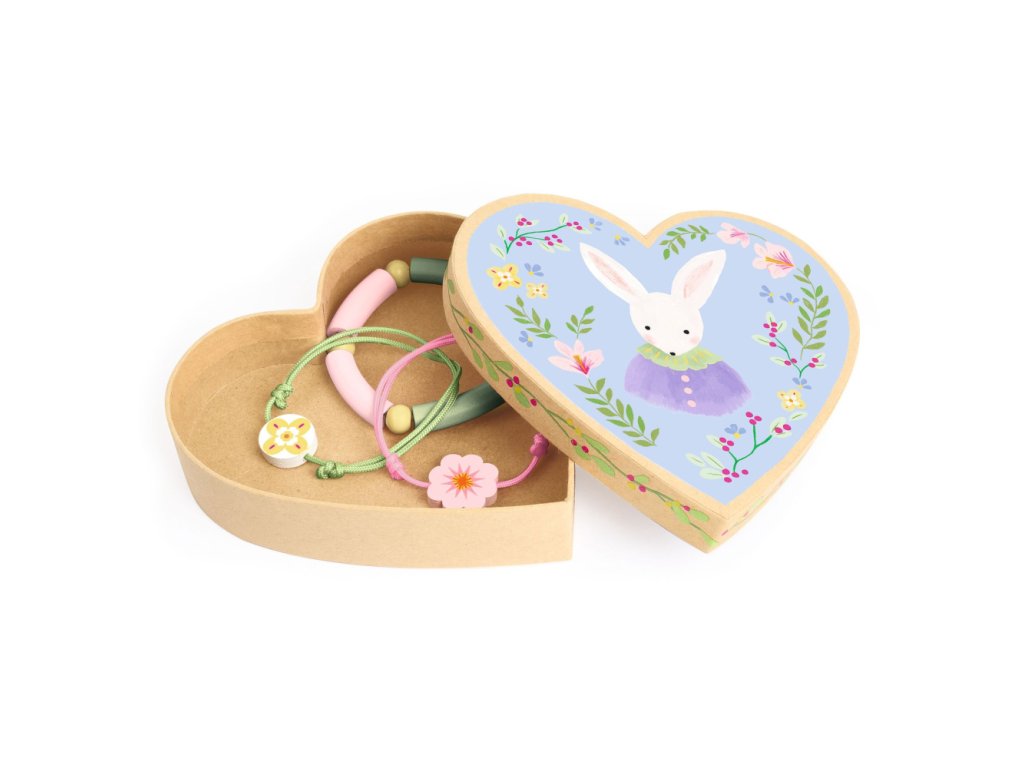 Krásna darčeková krabička v tvare srdiečka s ilustráciou milého zajka v sebe ukrýva malé tajomstvo - 3 farebné náramky, ktoré vyčarujú úsmev na tvári každej malej parádnice.