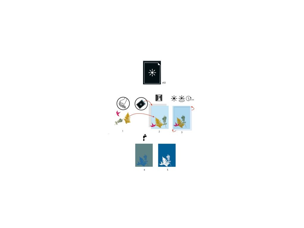 Tieto náplne z fotocitlivého papiera, kompatibilné s kyanotypovými tvorivými sadami DJECO, môžu byť použité samostatne s vybranými prvkami alebo s dodanými tlačenými vzormi. Po vystavení slnečnému žiareniu je papier označený negatívnymi vzormi. Jednoducho opláchnite papier vo vani s čistou vodou a výtvory sa odhalia na modrom pozadí! Táto sada vám umožní vytvoriť 8 jemných a poetických kompozícií.