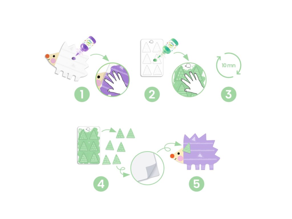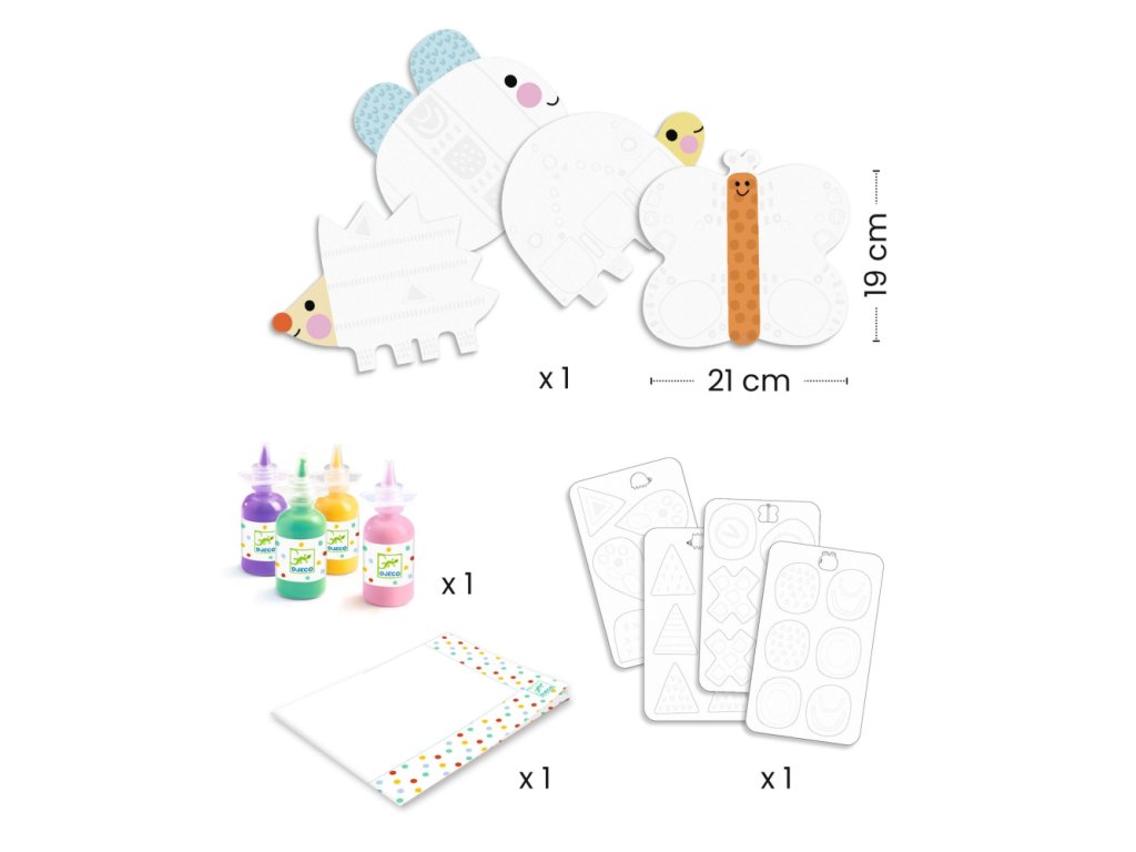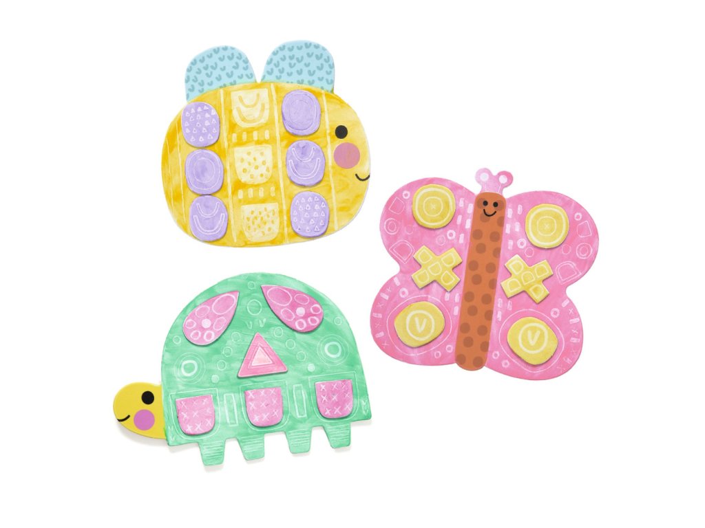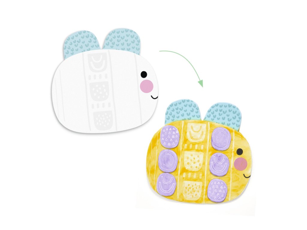 Kreatívna sada pre deti, v ktorej môžu vyfarbovať zvieratká prstami len niekoľkými kvapkami farby. Malé vzory sa objavia ako mávnutím čarovného prútika! Následne môžu deti nalepiť rôzne tvary, aby boli zvieratká ešte roztomilejšie!