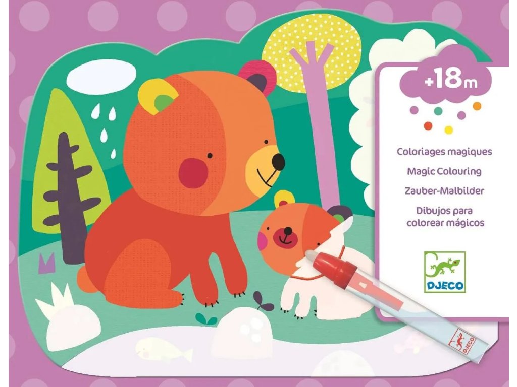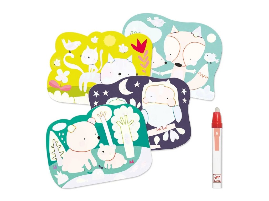 Opakovane použiteľná malá kreatívna sada 4 obrázkov na magické vyfarbovanie vodou je ideálna na vzbudenie záujmu batoliat o maľovanie a na rozvoj jemnej motoriky. Atraktívne ilustrované obrázky z ohybného plastu majú špeciálne biele plôšky. Po pretretí plôšok vodou sa ukážu farebné ilustrácie pod nimi. Po uschnutí opäť zbelejú a magické objavovanie so štetcom v ruke môže začať odznova. Štetec má široký a pevný filcový hrot a nádržku na vodu. Balené v praktickej priehľadnej fóliovej obálke.