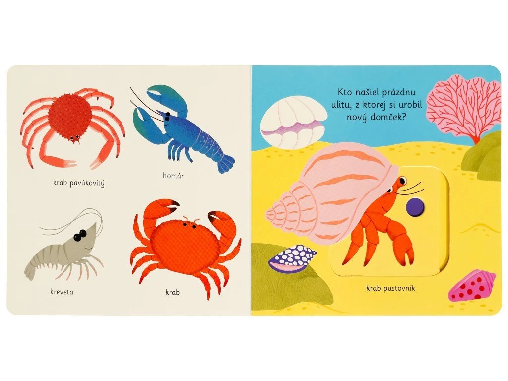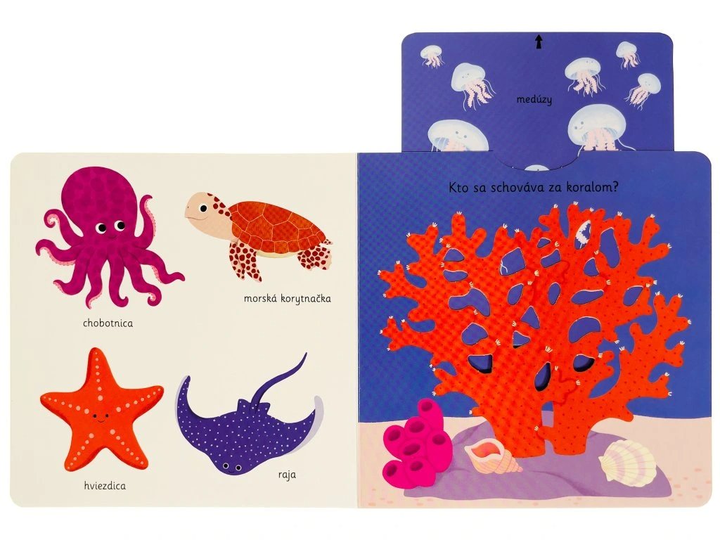 Objavovať oceán a morské živočíchy je s týmto leporelom také zábavné! Kto našiel nový domček v ulite? Kto pláva medzi morskými riasami a kto sa to schováva za koralom? Stačí len vložiť prstík do správneho otvoru a zľahka vysunúť alebo zatiahnuť a hneď bude váš malý objaviteľ či objaviteľka poznať odpovede. Leporelo je určené pre najmenšie deti a má pevné stránky s posuvnými prvkami. Naši najmenší si tak môžu pri prezeraní a spoznávaní morských živočíchov precvičiť aj jemnú motoriku.