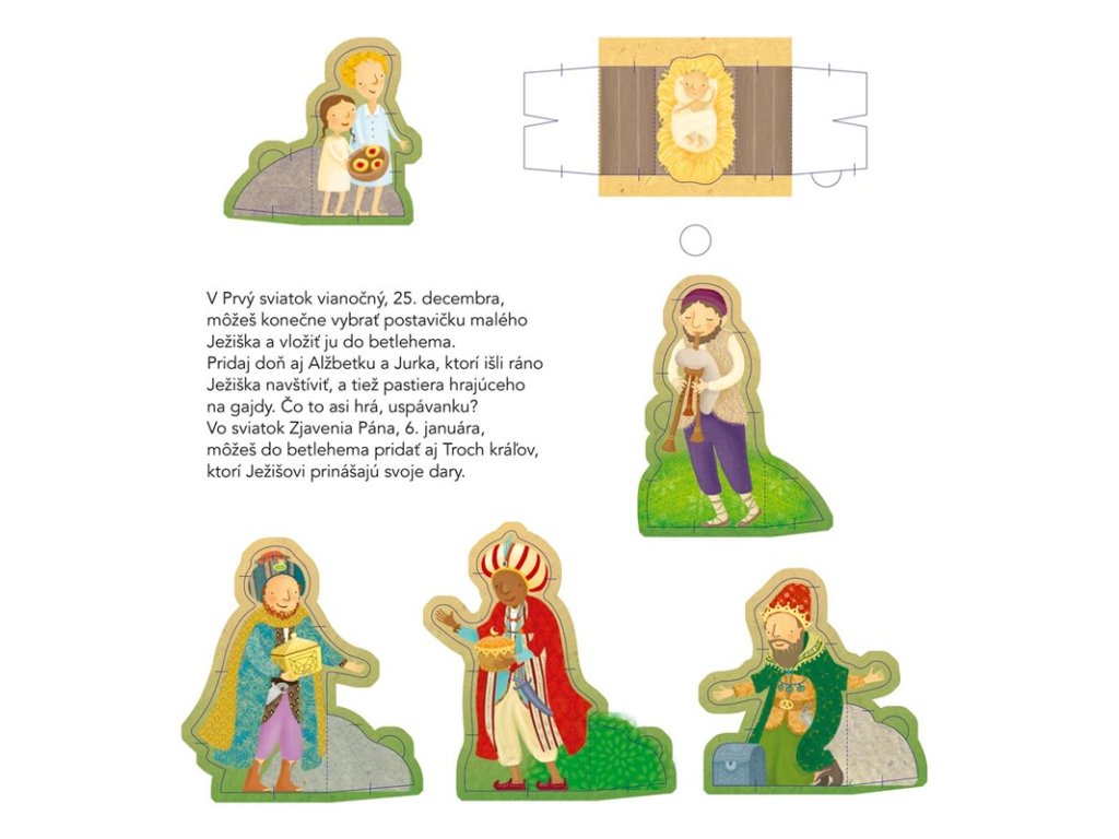 V tejto interaktívnej knižke si najskôr prečítaš príbeh narodenia Ježiša a potom ju môžeš premeniť na veľký betlehem so žiariacou kométou. Kniha obsahuje 24 otváracích okienok a postavičky Ježiška a Troch kráľov, ktoré do betlehema pridáš 25. decembra a 6. januára.