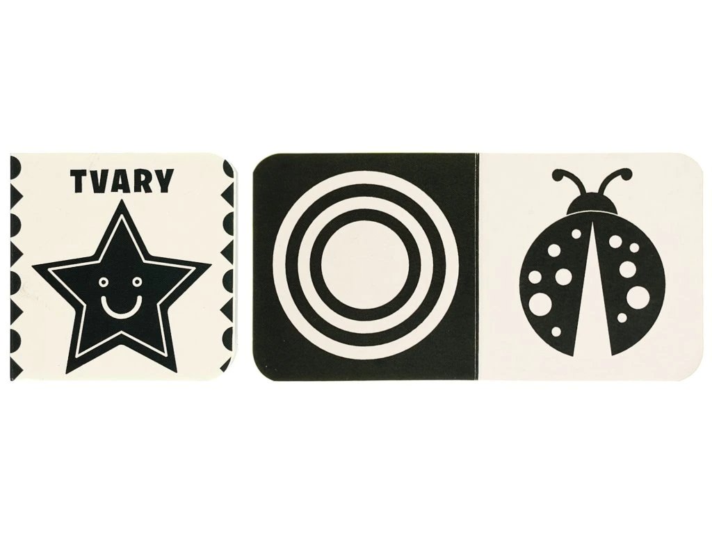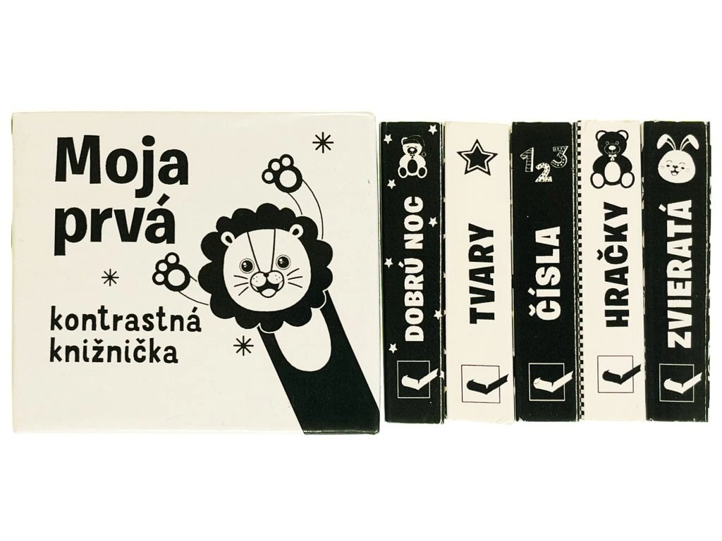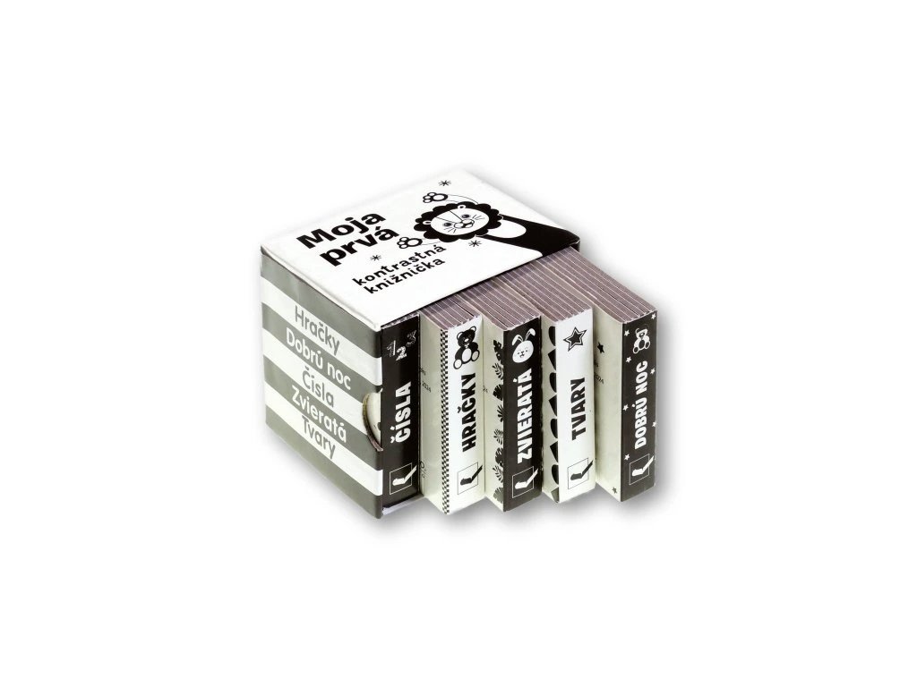 Knižnička s piatimi čiernobielymi leporelami na tému zvieratá, tvary, predmety a iné. Praktický box kontrastných knižiek pre bábätká.
