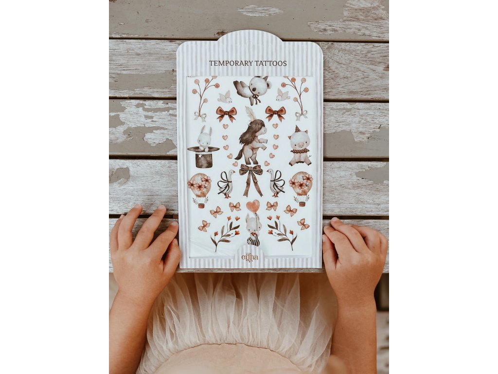 25 veľkých dočasných tetovačiek s rozprávkovými ilustráciami (sloník, medvedík, balón, hviezdičky…) sú skvelým doplnkom na oslavy, fotenie alebo len tak – pre radosť.