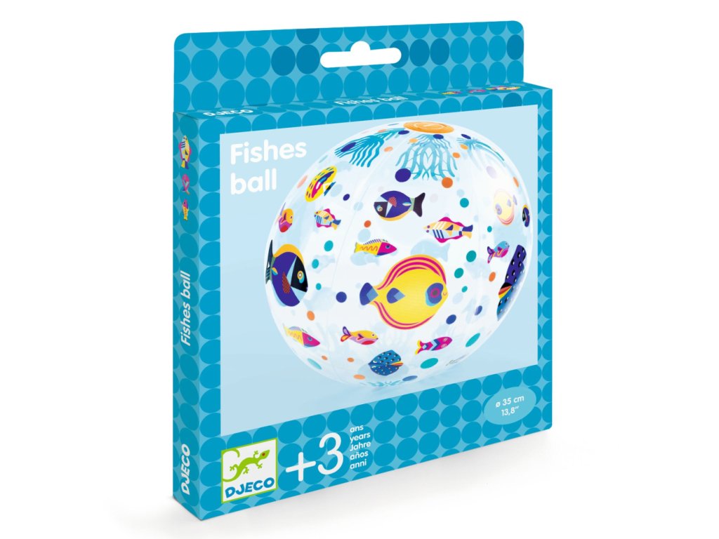 S farebnou potlačou žiarivých tropických rýb. Lopta je ľahká a po vypustení vzduchu nezaberá veľa miesta.