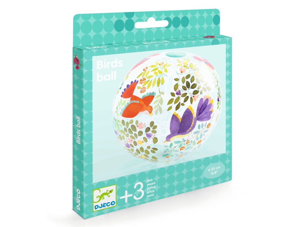 S farebnou potlačou vtákov a konárikov s kvetmi. Lopta je ľahká a po vypustení vzduchu nezaberá veľa miesta.