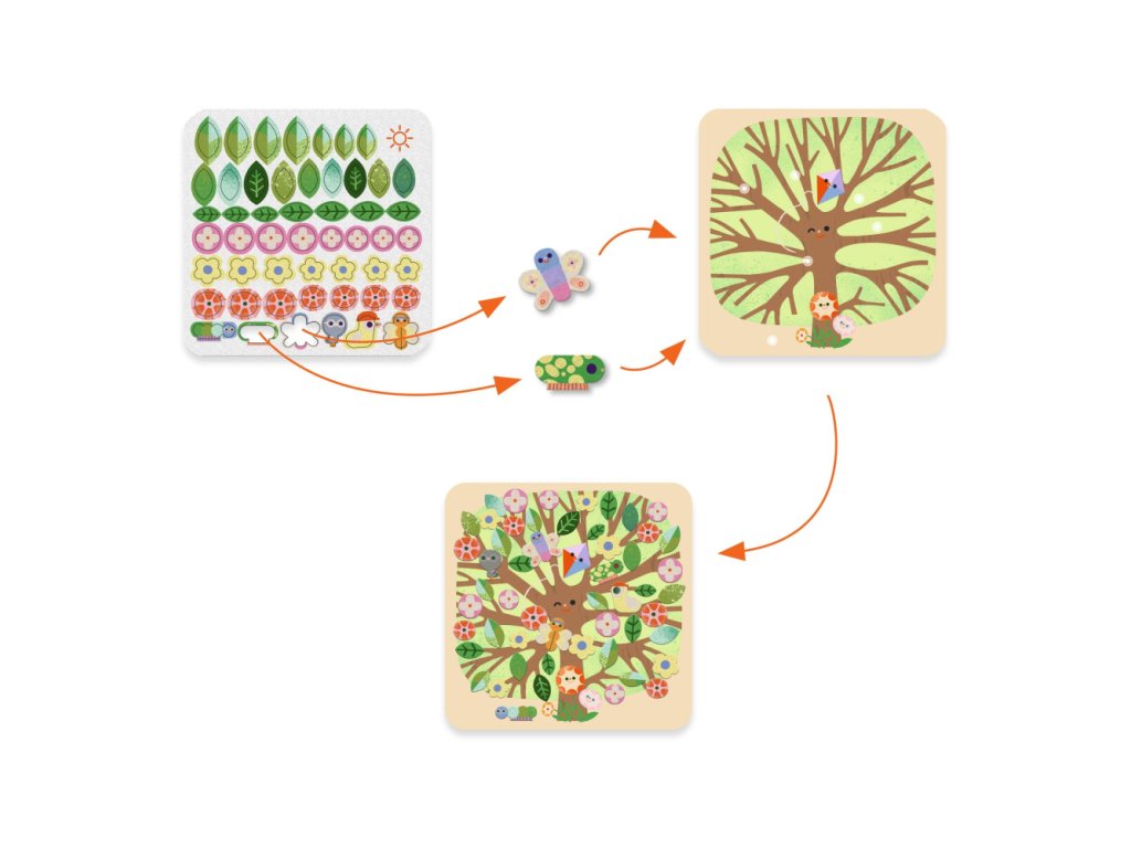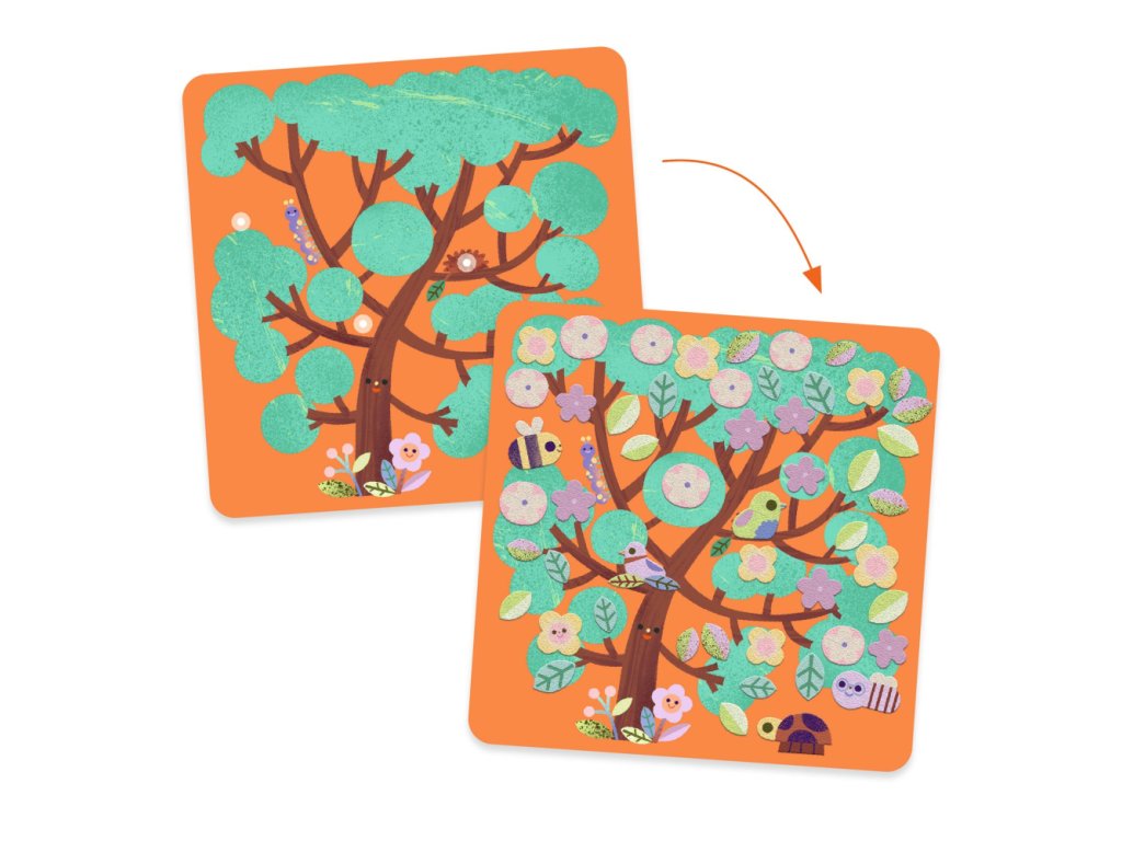 Kolážová aktivita z mäkkej plsti, ktorá oživí stromy. Aktivita, ktorá je zároveň vedená aj voľná, ideálna na stimuláciu jemnej motoriky dieťaťa a prebúdzanie jeho kreativity.