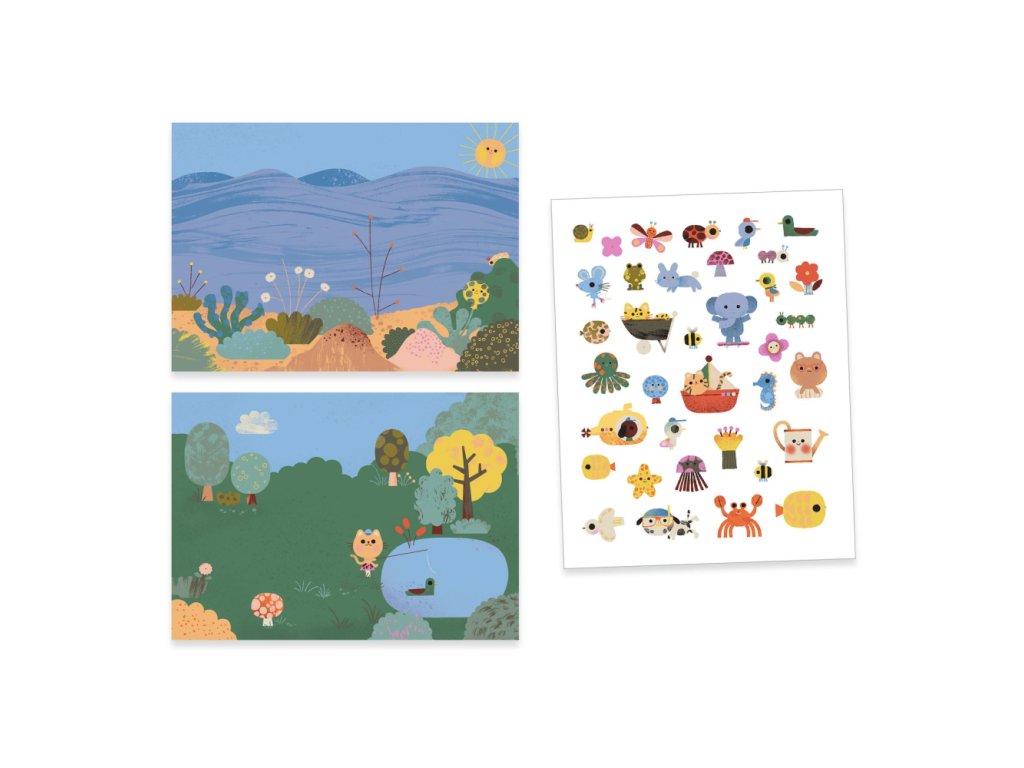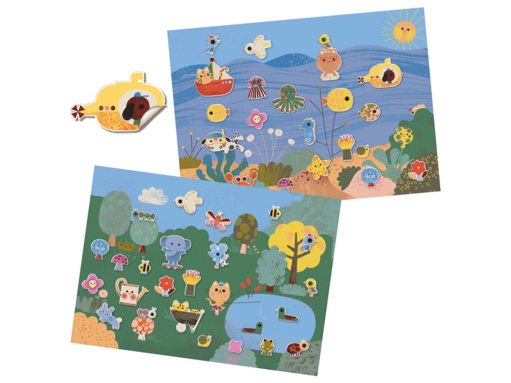 2 veľké ilustrované pozadia, ktoré deti môžu oživiť a vytvoriť zábavné a dobrodružné scény.