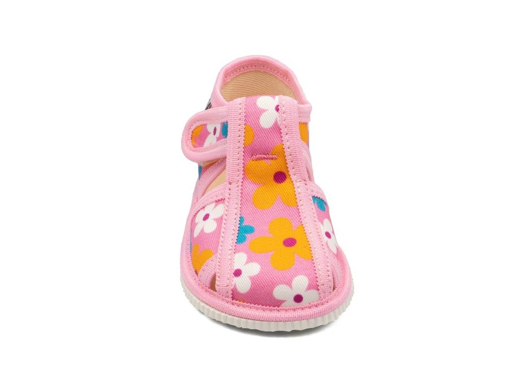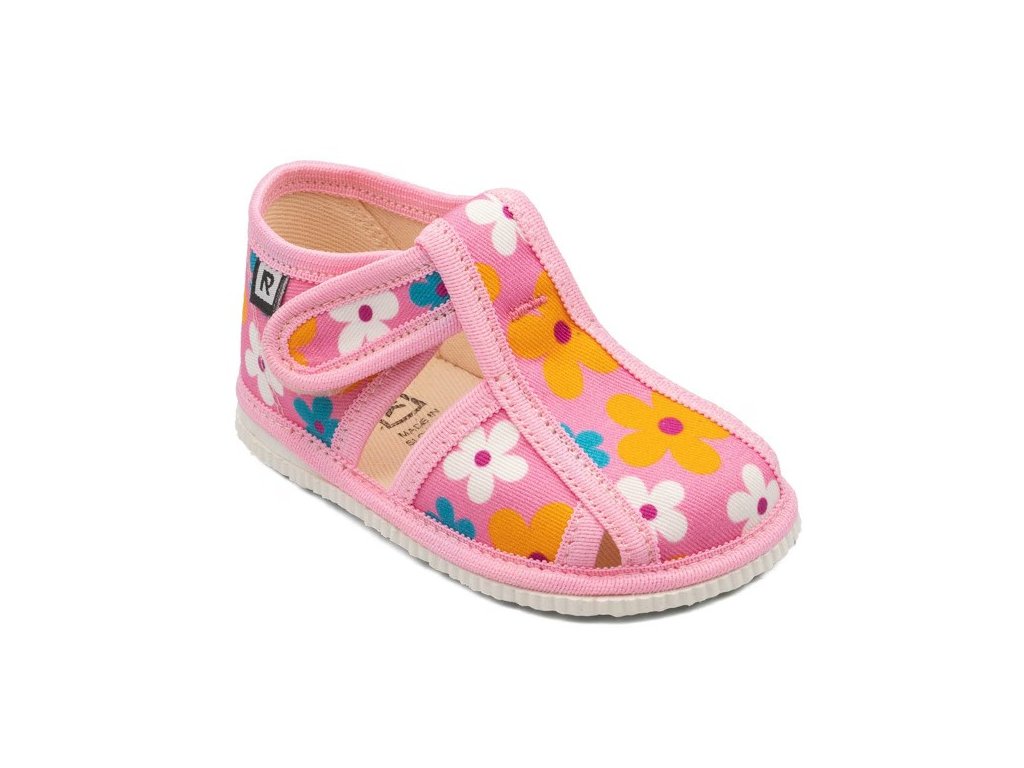 Detské papuče sandálkového strihu s uzavretou špicou so zapínaním na "suchý zips ". Tvar špičky s dôrazom na typicky detský dominantný palček zabezpečuje dostatočný priestor pre prsty. Papučka je ľahká, pružná vyrobená z textilu ( zo 100% bavlny ), ktorý zabezpečuje priedušnosť a dokonalú prispôsobilosť tvaru nohy. Stielka papučky je v časti klenku vyplnená penovým materiálom, čo zabezpečuje dieťaťu pohodlnú chôdzu a podporuje zdravý vývoj nohy. Obuv je určená do interiéru ako prezúvková obuv. Má certifikát o zdravotnej a hygienickej nezávadnosti. Okrem toho bola posudzovaná komisiou zloženou z ortopéda, detského lekára, modelára a odborníkov na obuv, na základe čoho získala licenciu na používanie ochrannej známky " Žirafa " a " Česká kvalita ".