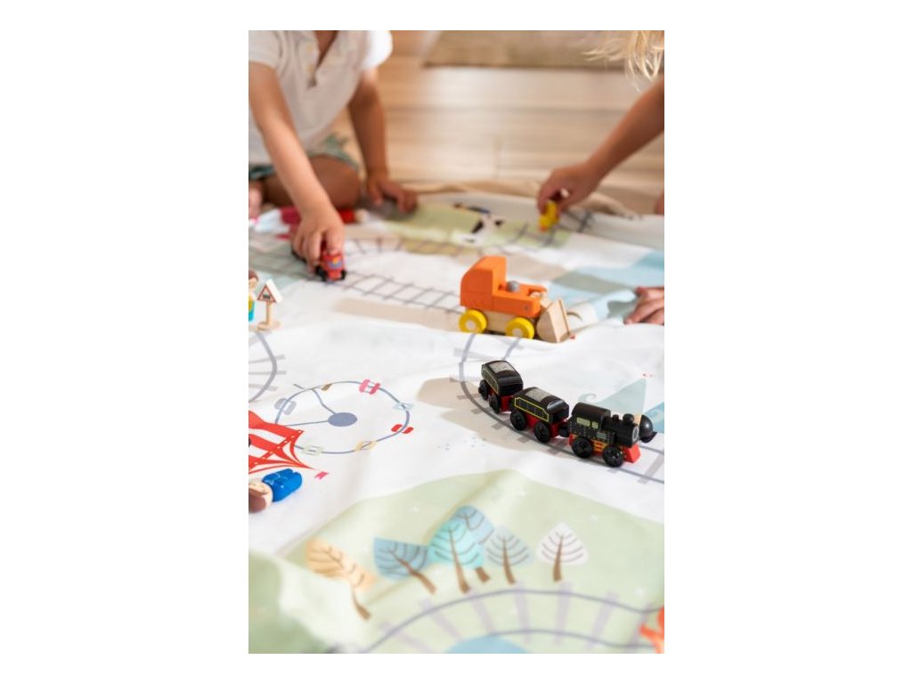 Biely vak s potlačou železničnej trate o priemere 140 cm je vyrobený z pevnej prémiovej bavlny/tkaniny podľa svetových štandardov šetrenia životného prostredia.
