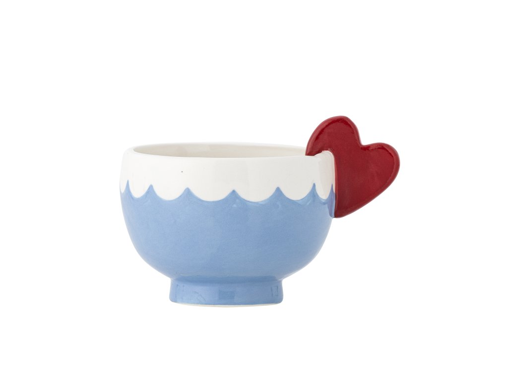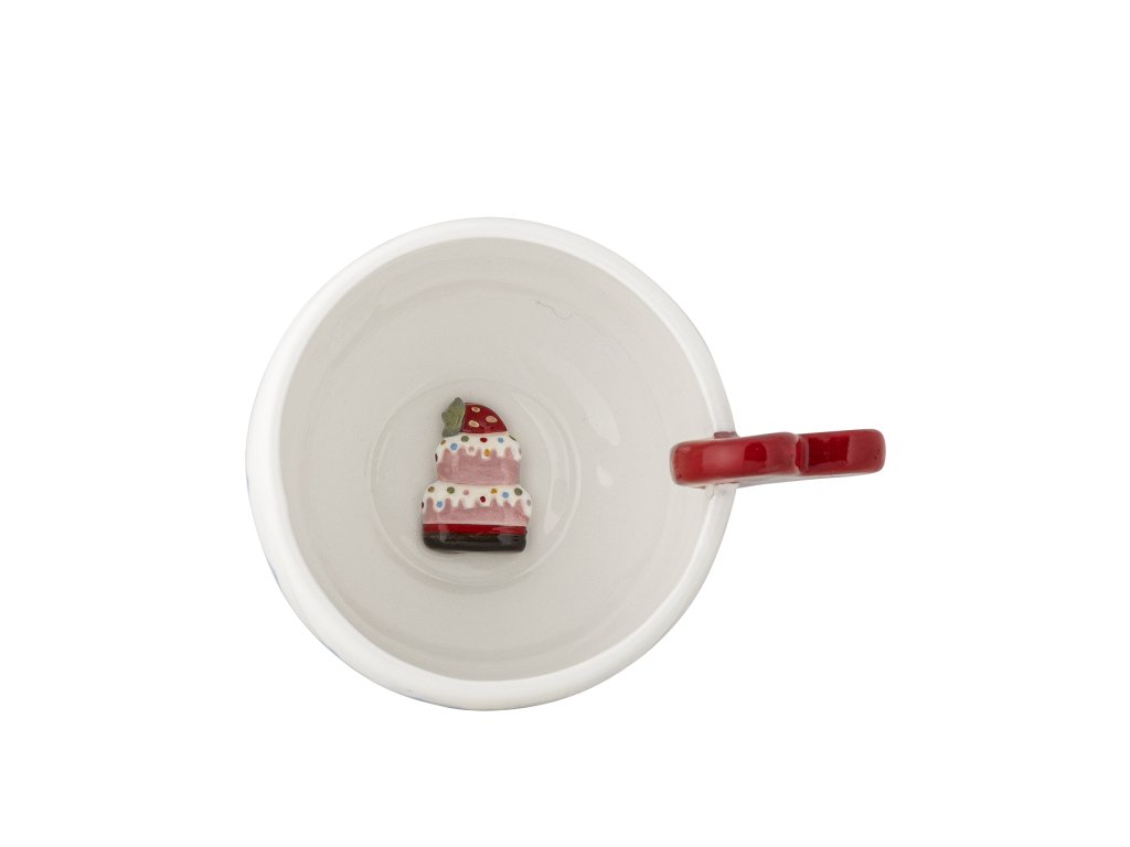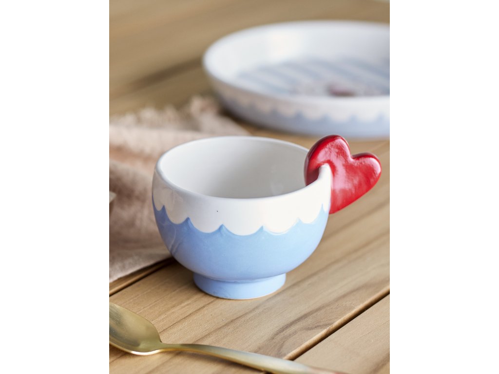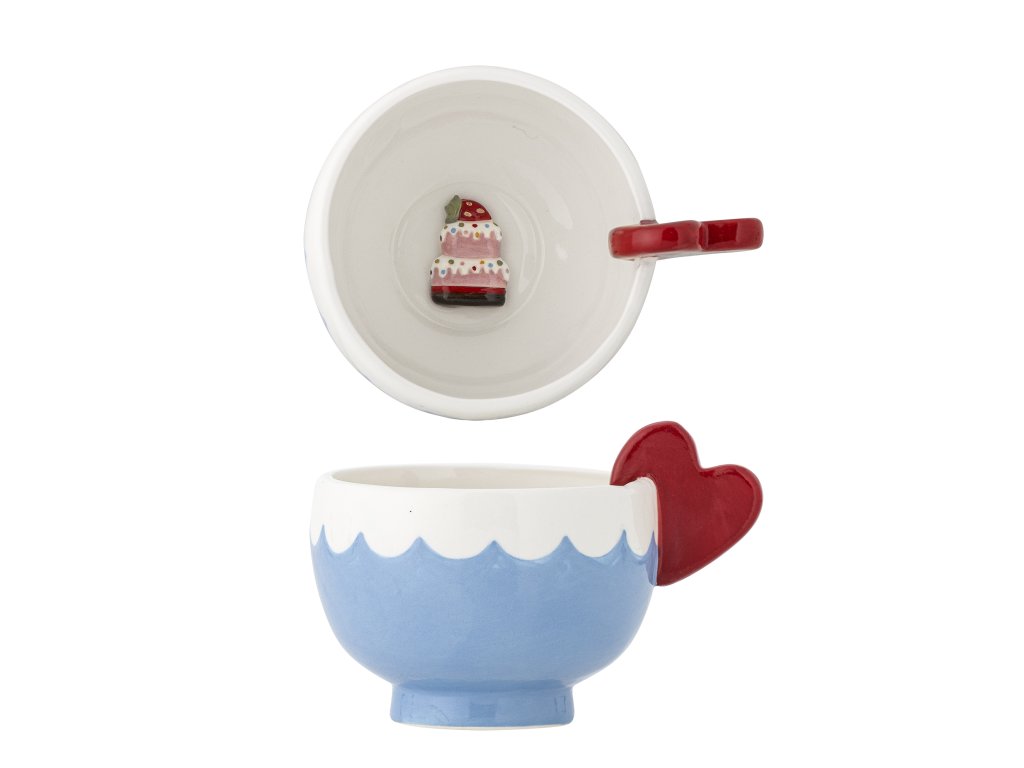 Pohárik Lively od Bloomingville je vyrobený z kameniny a má pôvabnú červenú rúčku v tvare srdiečka a svetlomodrý vlnkový okraj. Ideálna šálka na príjemné chvíle s horúcim kakaom, marshmallow a teplými objatiami alebo poslúži aj ako šálka na kávu pre dospelých. Keď si vychutnáte svoj nápoj až do dna, vo vnútri na vás čaká ukryté malé tajomstvo - ručne maľovaná dekorácia torty.