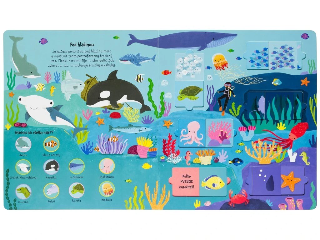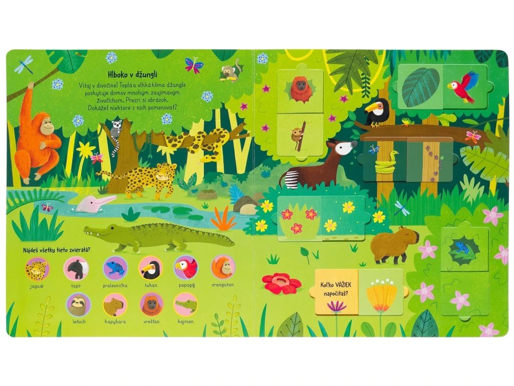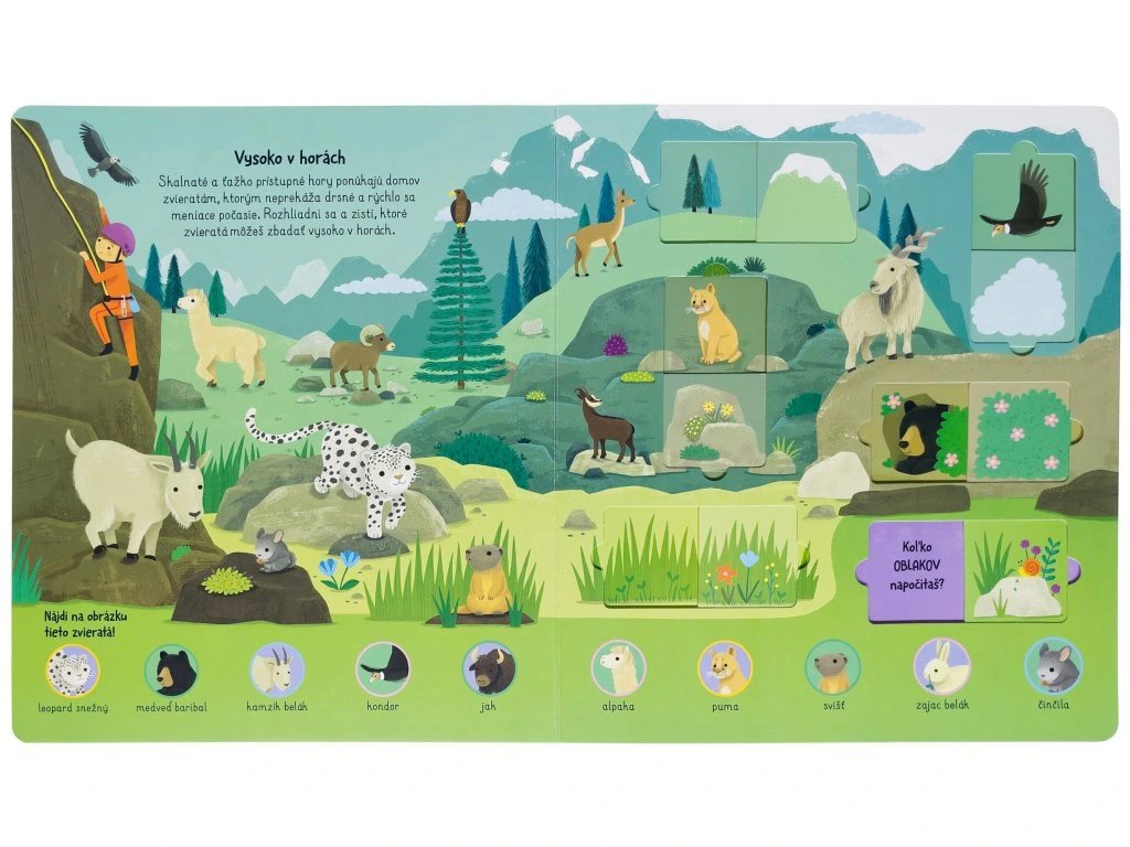 Interaktívna kniha s posuvnými okienkami zoznámi deti so zvieratami z celého sveta v 5 rôznych prostrediach, od koralových útesov až po majestátne pohoria.