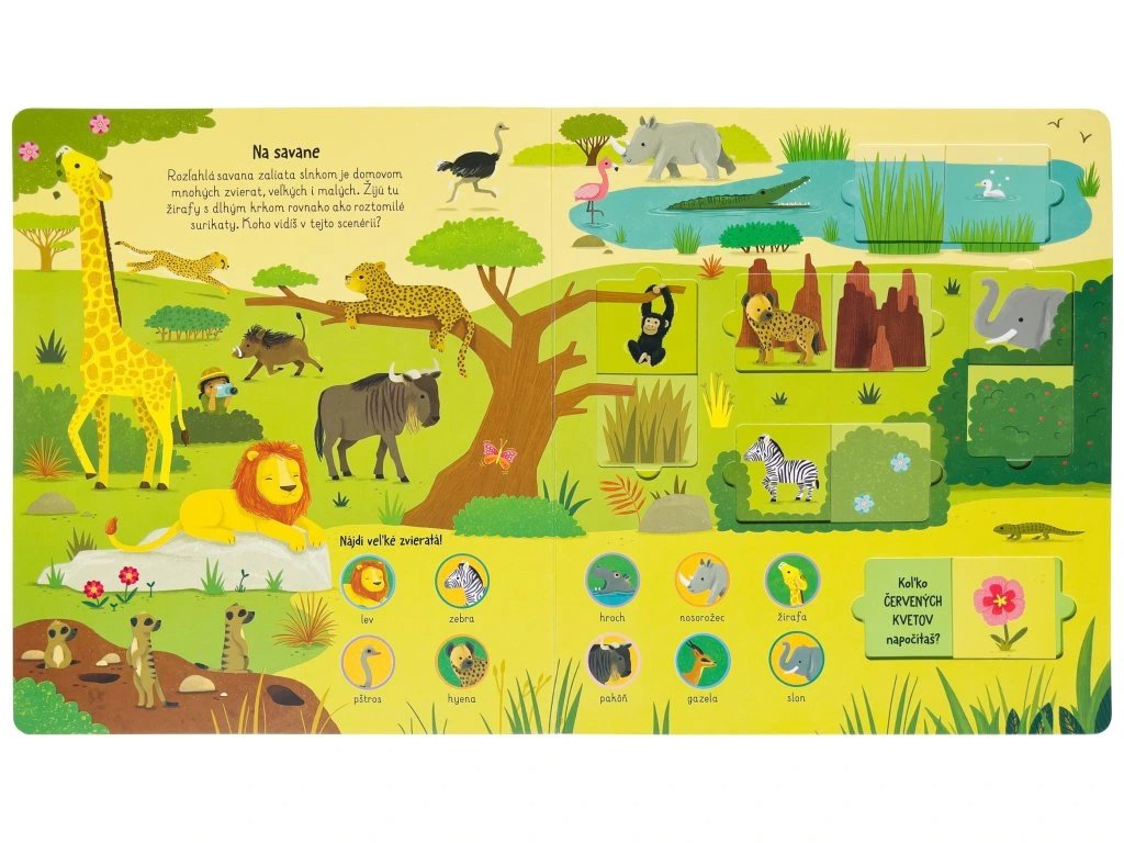 V tejto knihe s posuvnými okienkami sa deti v 5 rôznych prostrediach zoznámia so zvieratami z celého sveta. Každé prostredie je krátko uvedené spoločne s úlohou na hľadanie najrôznejších zvierat. Jasné ilustrácie a opisy pomôžu deťom lepšie spoznať ríšu zvierat a zoznámiť sa s ňou. Za posuvnými okienkami sa ukrývajú úlohy na počítanie a pozornosť. Táto interaktívna kniha s roztomilými ilustráciami je ideálnou voľbou pre všetkých milovníkov i milovníčky zvierat a prírody.