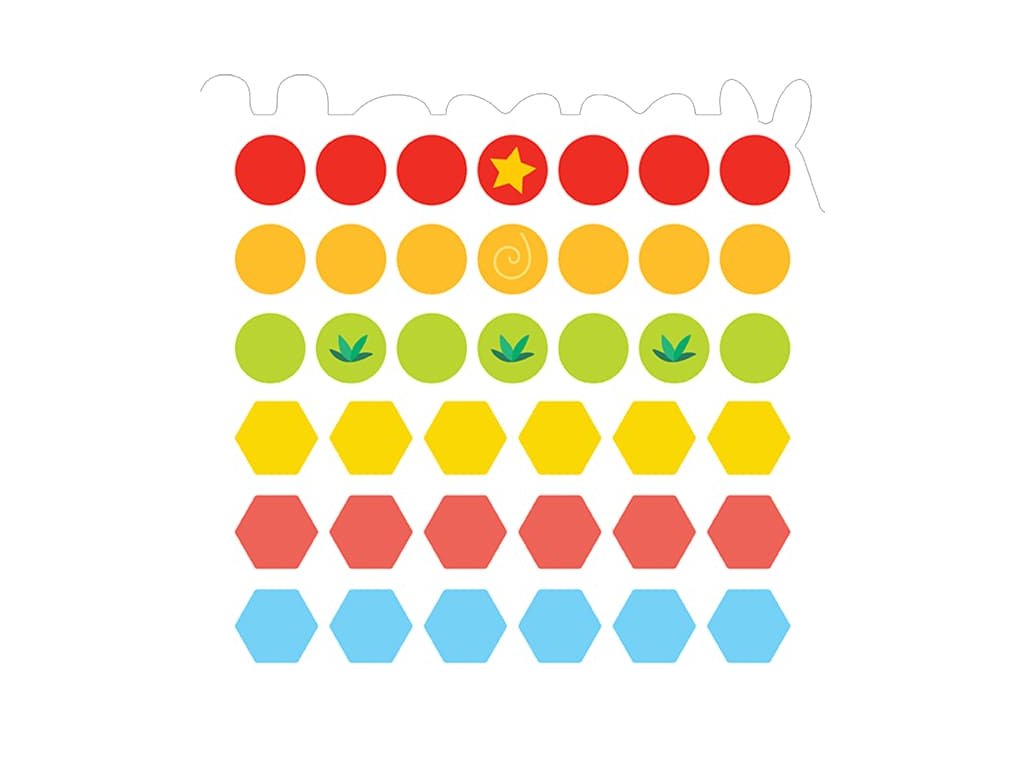 Tvarovaná samolepková knižka malého formátu obsahuje 16 strán a 8 listov opakovane použiteľných samolepiek farebných tvarov, ktoré deti dolepujú do obrázkov podľa príslušnej farby a tvaru.