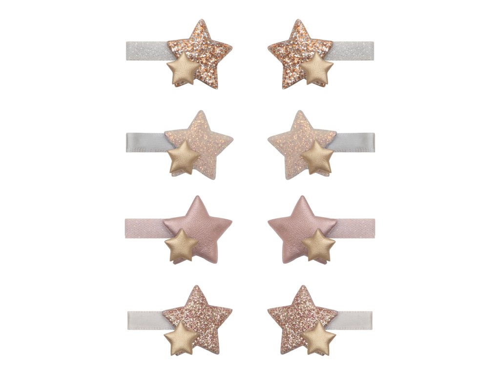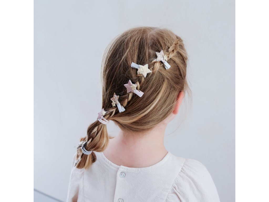Praktické a zároveň krásne mini sponky/klipy pre všetky malé parádnice v sviatočných pastelových farbách, na konci ktorých sú umiestnené malé trblietavé hviezdičky. Výborne držia aj na jemných vláskoch. Môžete ich použiť na prichytenie vláskov zboku, alebo ako ozdobu do copikov a vrkôčikov.