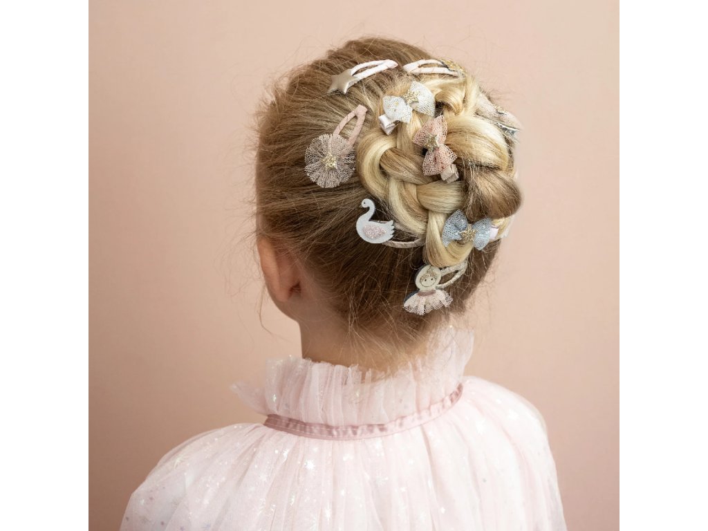 Päť klasických mini pukačiek obalených v tej najkrajšej pastelovej látke je dozdobených malými tutu kruhmi, uprostred ktorých je umiestnená malá zlatá trblietavá hviezdička. Super svieži look sponiek rozžiari každý jeden dievčenský účes. Dokonalá kombinácia farieb a materiálov. Výborne držia aj na jemných vláskoch. Môžete ich použiť na prichytenie vláskov zboku, alebo ako ozdobu do copikov a vrkôčikov.