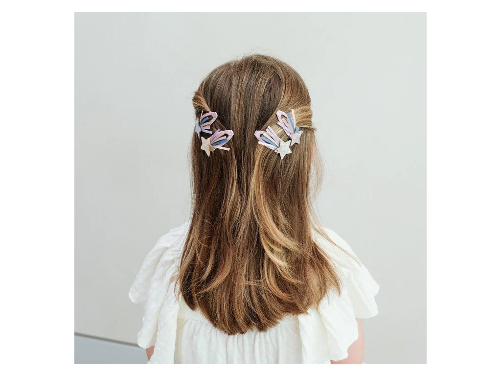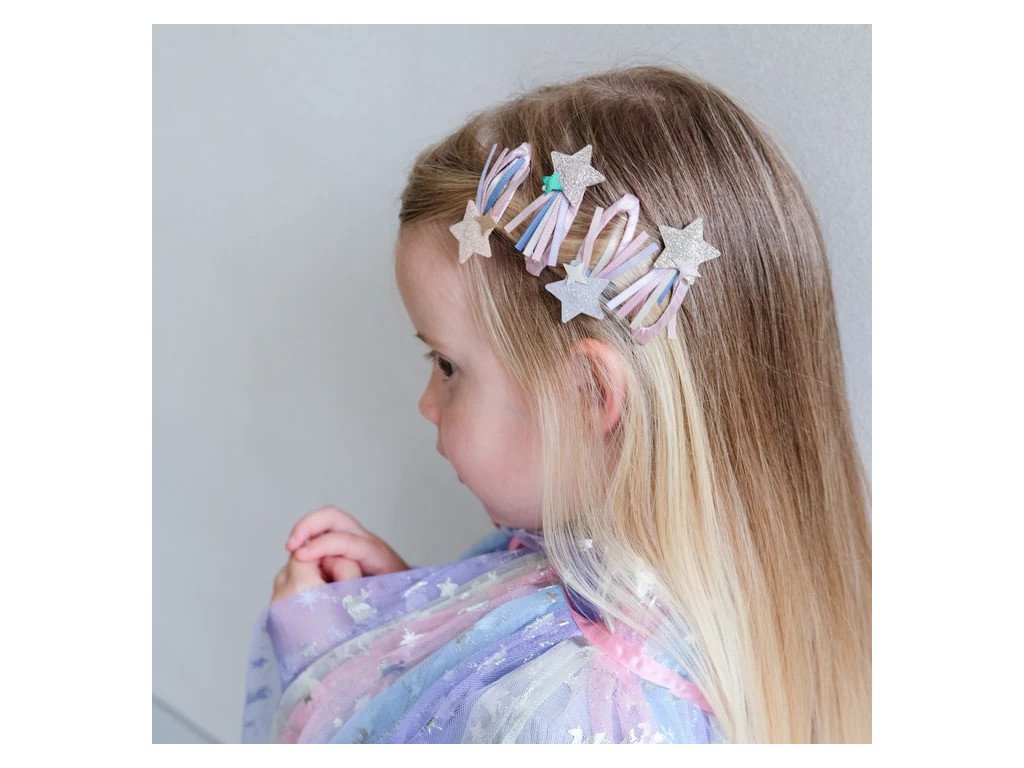 Štyri klasické pukačky obalené v tých najkrajších látkach sú dozdobené hviezdami s dúhovou stužkou. Super svieži look sponiek rozžiari každý jeden dievčenský účes.