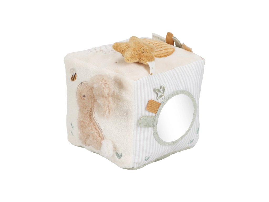 Mäkká plyšová kocka s krásnymi motívmi zo života husi a králika je vďaka svojmu prevedeniu ľahko uchopiteľná malými detskými ručičkami. Rôznorodé textúry, pripevnené hračky a vyšívané ilustrácie lákajú dieťa na skúmanie, kocka navyše pri pohybe jemne cinká.
