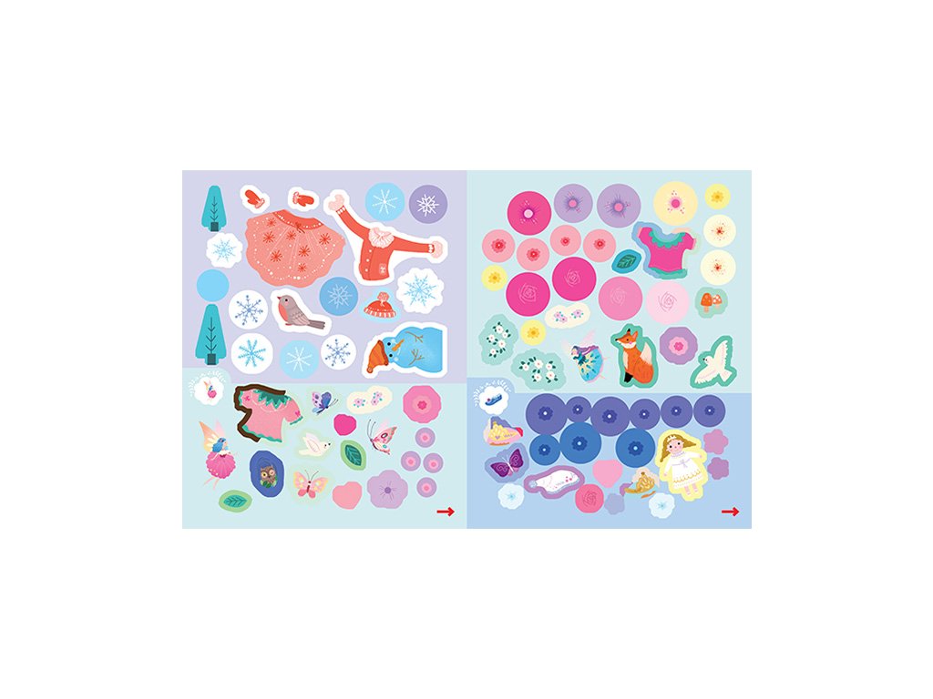 Samolepková knižka obsahuje 24 strán plných módy, 8 strán papierových samolepiek a 2 strany trblietavých samolepiek s glitrami.