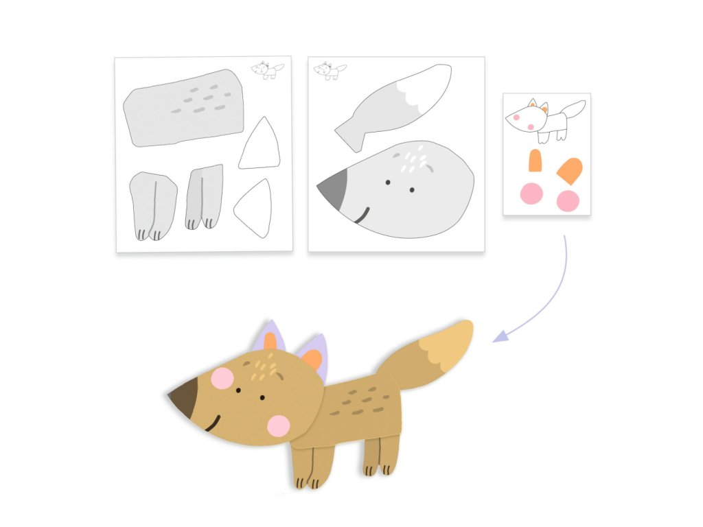 Maliarska činnosť pre začiatočníkov od 18 mesiacov. Dospelí vylúpnu predrezané tvary a umiestnia farbu na vrch. Potom je na deťoch, aby vložili ruky do farby a "zafúľali" sa, keď rozmazávajú farbu po tvaroch zvieratiek! Následne deti pospájajú tvary a pridajú nálepky. Vytvoriť vedia 4 úplne nádherné 2D zvieratá.