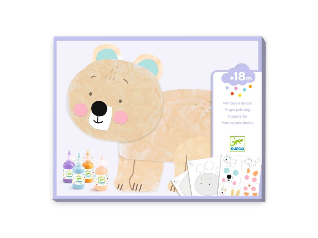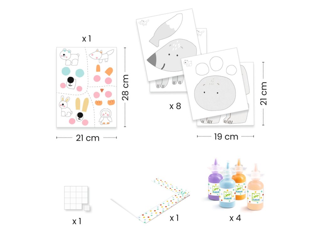 Obsah: 8 predrezaných, ilustrovaných hárkov vyrobených z hrubej lepenky. 1 hárok nálepiek. 4 fľaštičky prstovej farby. 1 chránič stola. 1 ilustrovaný návod.