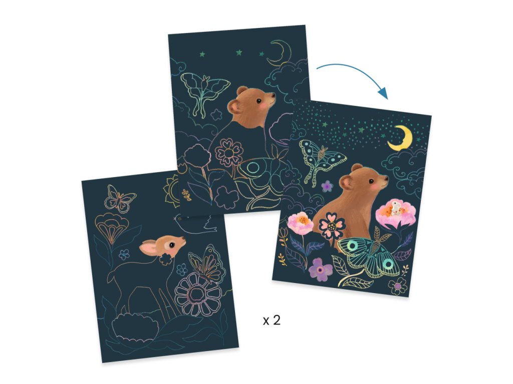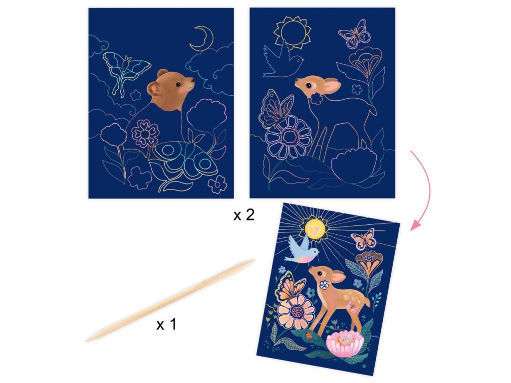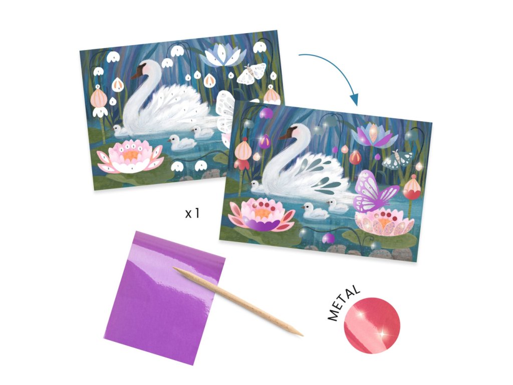 Vyškrabovanie: 2 vyškrabovacie obrázky s metalickým efektom + 1 drevená škrabka.