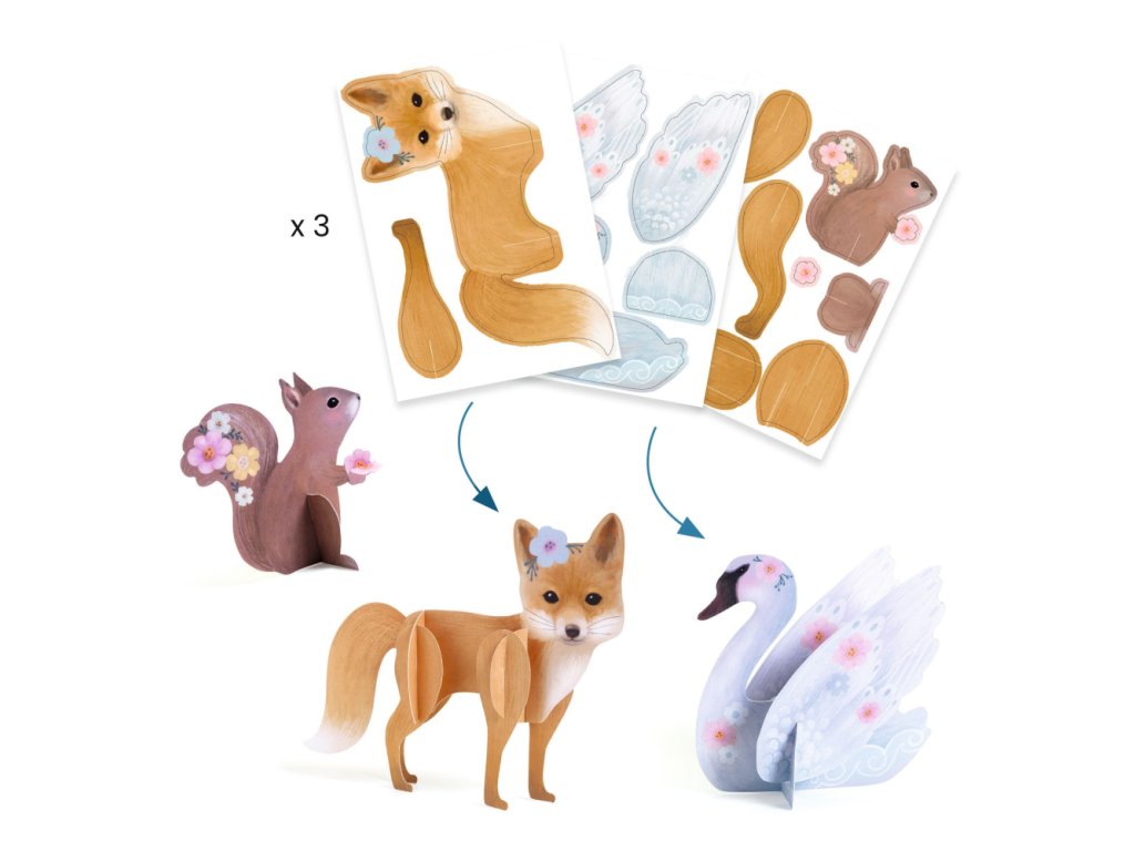 Skladanie 3D modelov zvieratiek: 3 listy vopred vyrezaných kartónových kúskov na vylúpnutie a poskladanie.