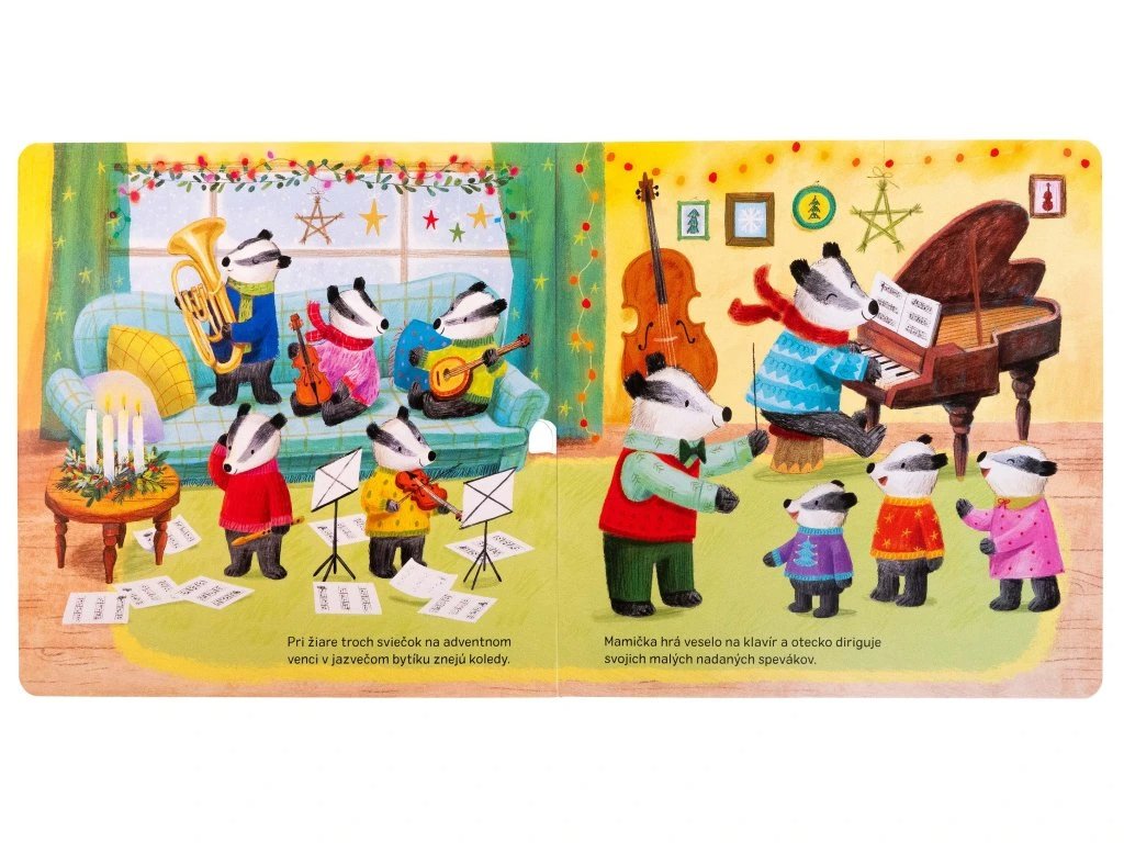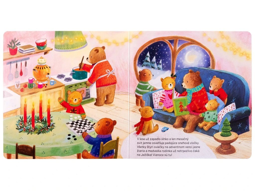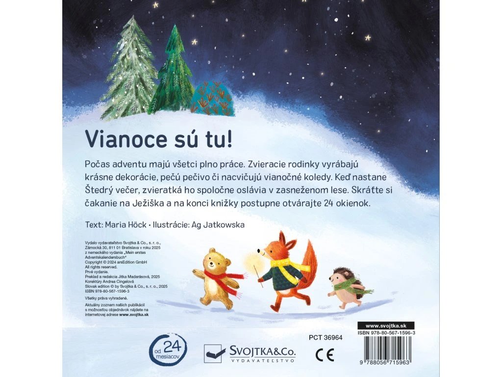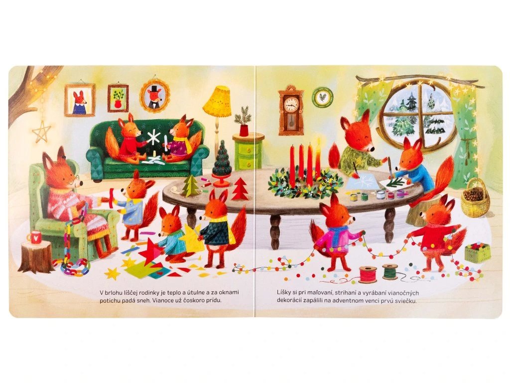 Behom adventu majú všetci plno práce. Zvieracie rodinky vyrábajú krásne dekorácie, pečú koláčiky alebo nacvičujú vianočné koledy. Až nastane Štedrý večer, zvieratká ho spoločne oslávia v zasneženom lese. Nahliadnite k zvieratkám do domčekov a nechajte sa zahriať kúzelnou sviatočnou atmosférou. Skráťte si čakanie na Ježiška a na konci tejto vianočnej knižky postupne otvárajte 24 adventných okienok.
